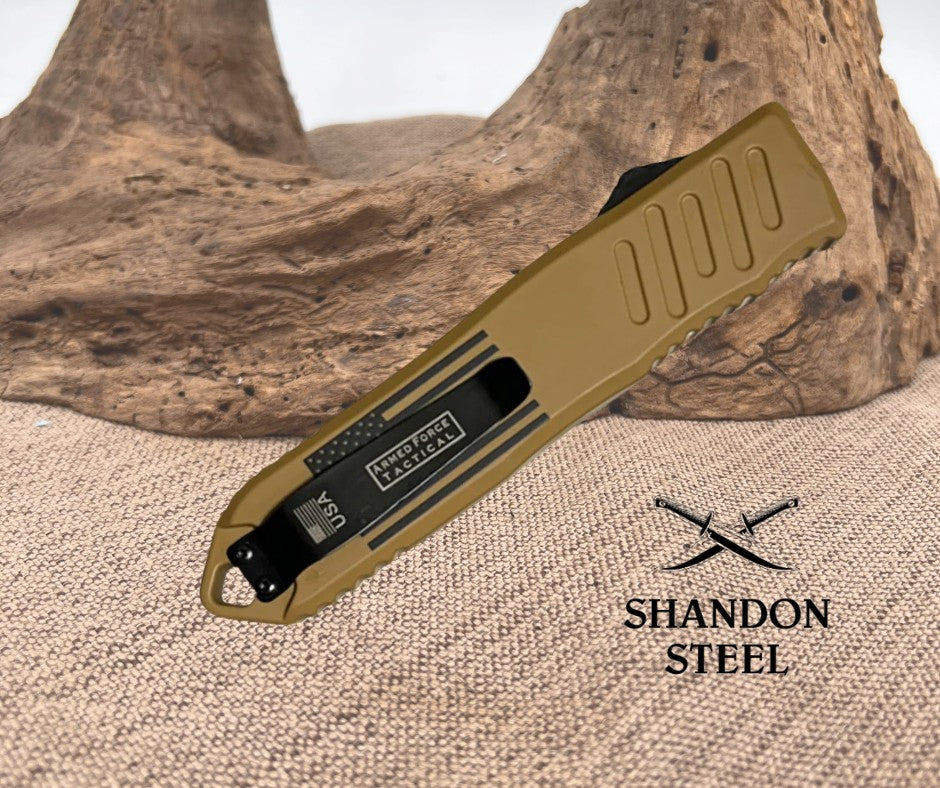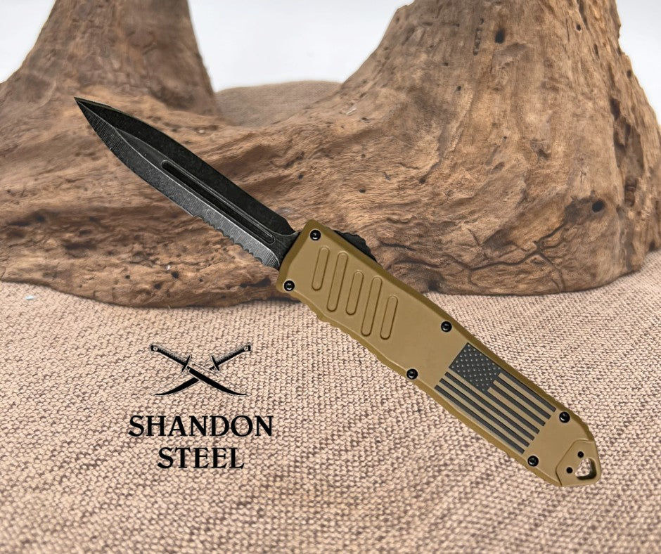 Armed Force Tactical double action OTF knife. 4 " half serrated stone washed dagger blade. 5.5"" closed. Zinc alloy handle with 3d printed US flag.