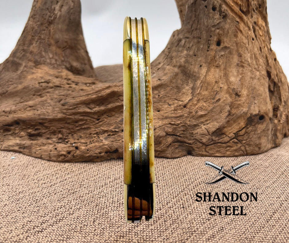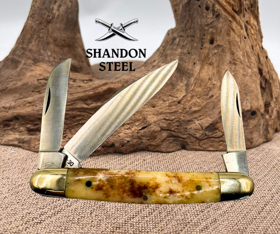 The American Blade Chattanooga, TN. Smooth Bone Long Pull Stockman Knife is a high-quality pocketknife with a stainless steel blade featuring a clip point, pen, and sheepsfoot design. This ambidextrous knife has a manual opening mechanism and a smooth bone handle in a cream color. With three blades and a slipjoint lock type, this original American Blade model AB-30 is a sought-after collectible piece, manufactured in Japan. This vintage knife is a must-have for collectors and enthusiasts of modern folding knives. Measures 3-7/8" closed.