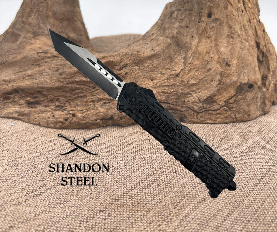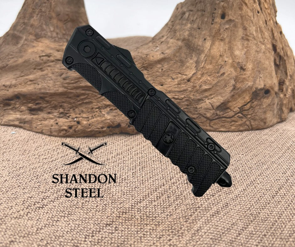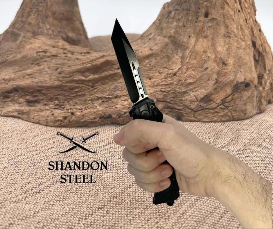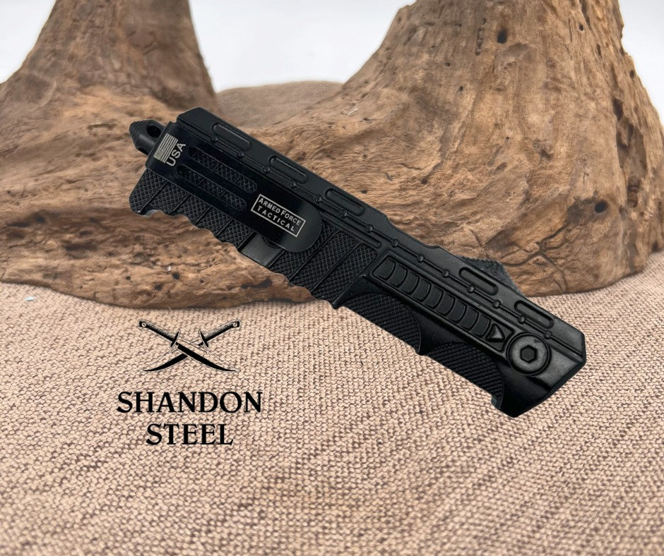 Armed Force Tactical. Large double action OTF knife. Tanto Blade. 5.5" closed. Black Zinc alloy handle.