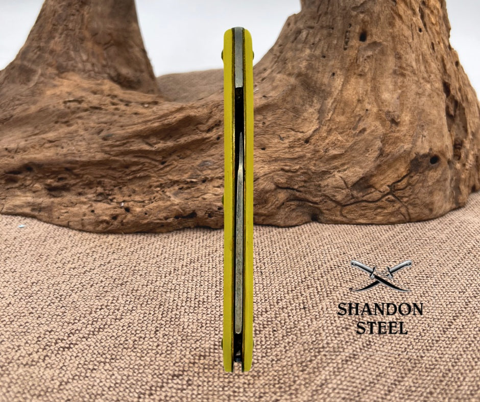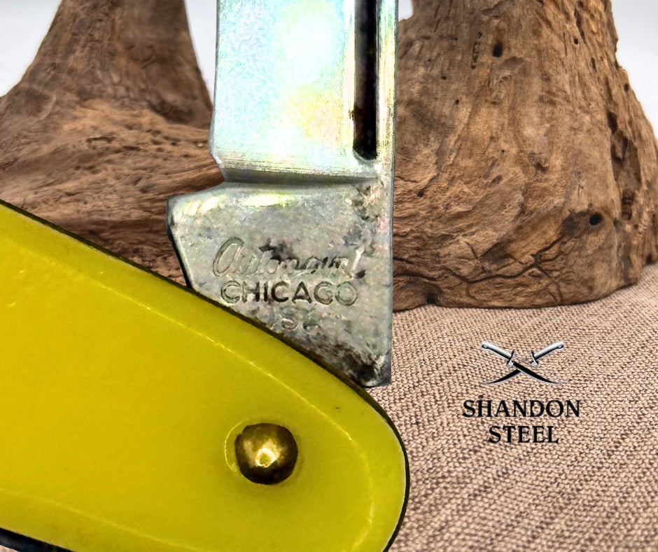 The Autopoint Pen Knife is a vintage pocketknife made in Chicago, USA with a classic design featuring a carbon steel blade and a slipjoint lock type. This ambidextrous knife has a 3 3/8" closed length, making it convenient for everyday carry. The yellow celluloid handles add a touch of nostalgia to this original collectible piece from the Autopoint brand. A must-have for collectors of vintage folding knives, this penknife is a unique and practical addition to any collection.