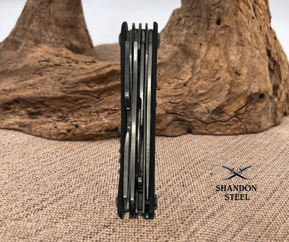 - 2CR13 stainless steel elements on this multi‑tool folding knife for excellent resistance against oxidation and torsion.