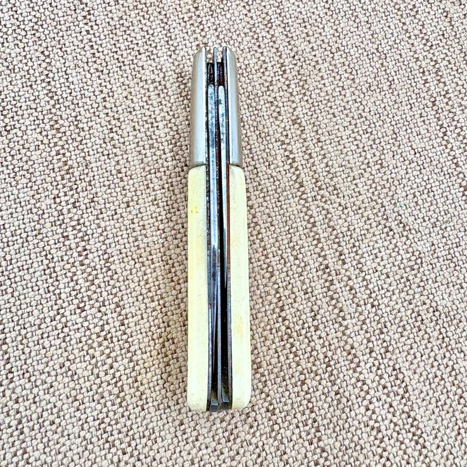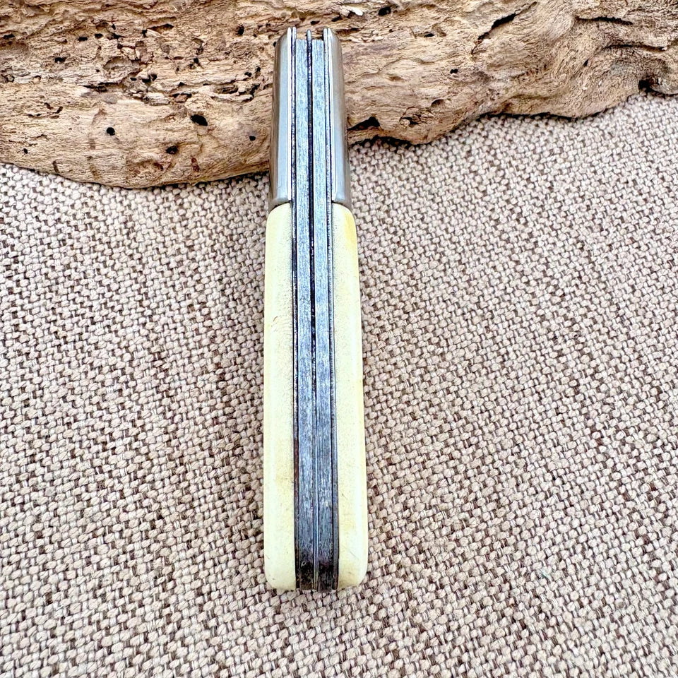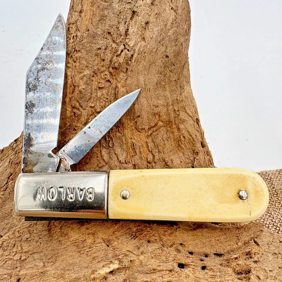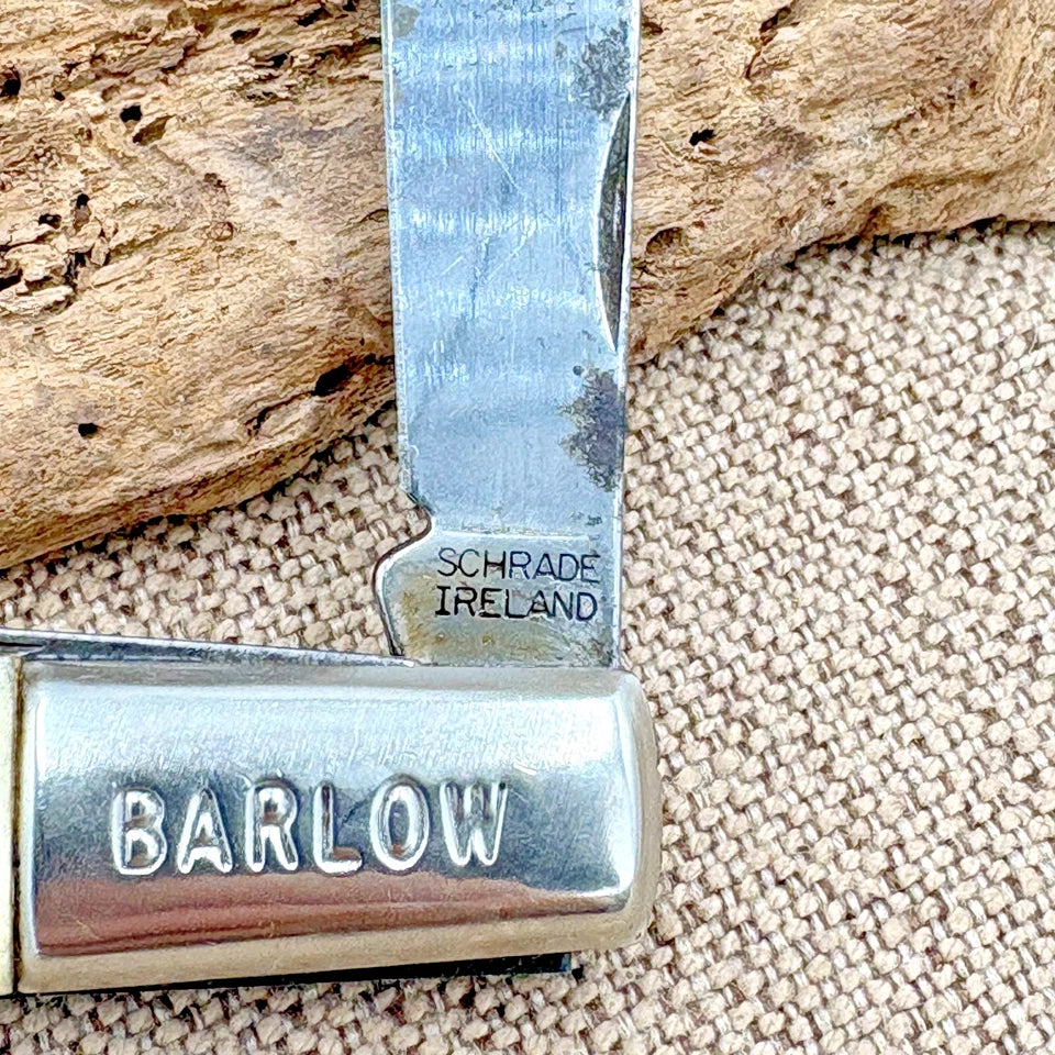 Crafted with precision and care, the Barlow Schrade Vintage Pocket Knife is a tribute to timeless utility and design. This pocketknife features a robust carbon steel blade material with a clip point and pen blade type, perfect for a wide range of tasks. The beige plastic handle provides a secure grip, ensuring comfort and control during use. With its manual opening mechanism and two blades, this knife is an original piece crafted in Ireland, boasting a slipjoint lock type for safety. The ambidextrous design makes it convenient for all users, while the plain edge blade allows for efficient cutting. Whether for everyday carry or as a collectible, this Schrade pocket knife is a reliable tool with a vintage touch. Measures 3-1/4" closed, carbon patina on blades, finish wear on handles, no wobble, good snap.