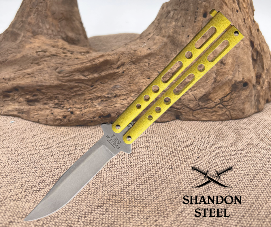 5" (12.7cm) closed. 3.5" (8.89cm) stonewash finish stainless clip point blade. Yellow powder coated zinc handle. Boxed. BC117YSW
