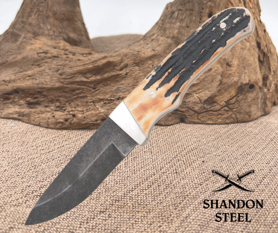 7.88" (20.02cm) overall. 3.63" (9.22cm) Damascus steel blade. India stag bone handle. Nickel silver bolster(s). Full tang. Leather belt sheath.