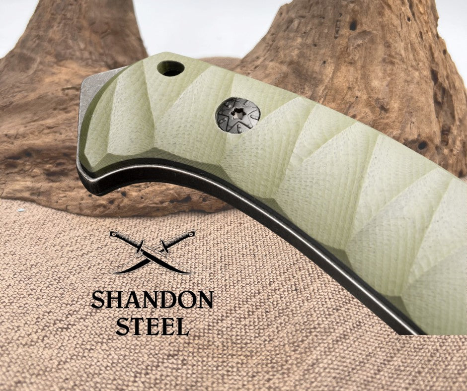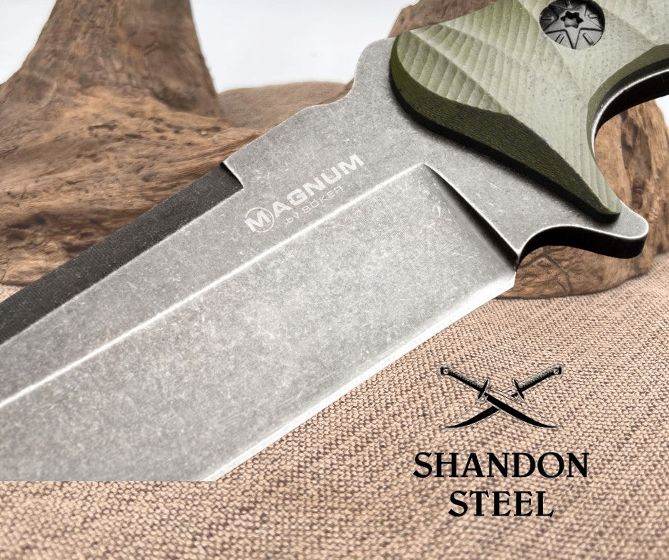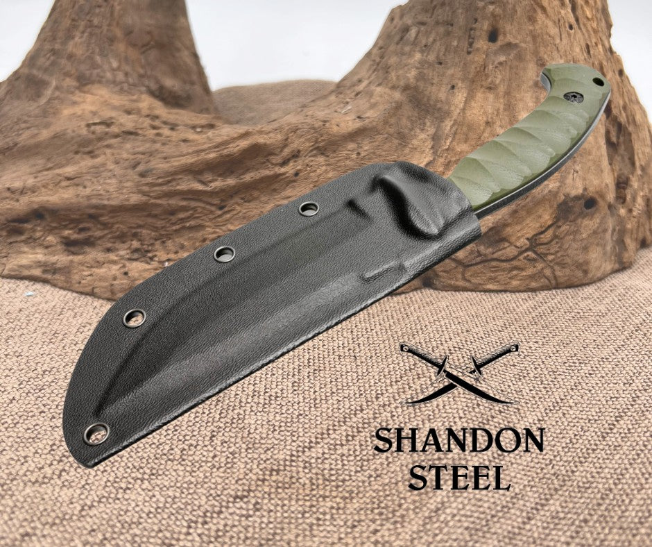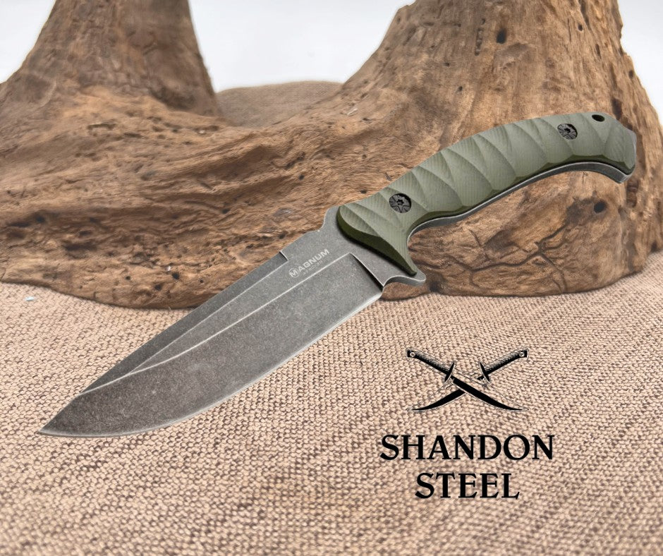 The Magnum Persian Fixed is a full-sized outdoor knife with Persian roots. The 440 stainless steel blade was conceived in the shape of a modified drop-point blade. The grip design features an oriental influence that is frequently found on Persian knives. The distinctive index finger groove and the downward sloping grip are indicators of its origins. The full tang construction terminates in a skull crusher with tapered point. The green G10 scales have a pleasant texture. With lanyard hole, kydex sheath and belt adapter.