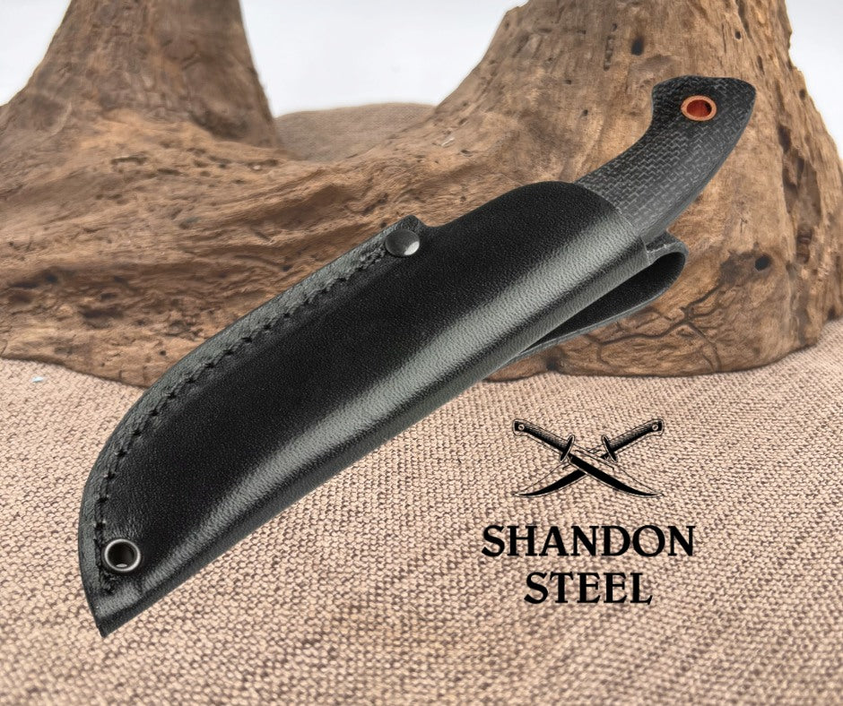 The handy Boker Plus Nessmi Pro owes its name to the American adventurer George W. Sears, who lived in the eastern United States from 1821 to 1890 and wrote books and magazine items about life in the wilderness under the pseudonym "Nessmuk". To honour his concept of outdoor equipment that is as lightweight as possible, the Danish knifemaker Jesper Voxnaes has developed this particularly compact version of the Nessmuk knife. The knife, made of D2 in full tang construction, is not only suitable for outdoor use and hunting, but also proves its worth in everyday life. The handle scales made of black micarta and the black powder coating of the blade give the Nessmi Pro a tactical look, while the hollow copper rivets add a colourful accent and also serve as a lanyard hole. Supplied with a black leather sheath.