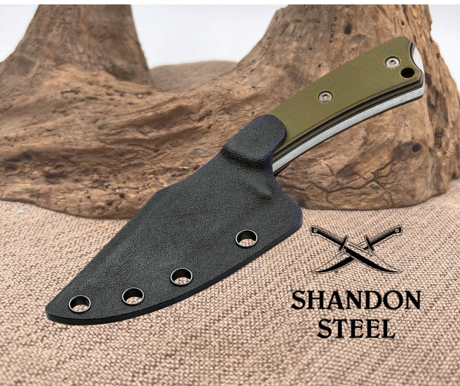As a compact outdoor knife that can either be worn as a neck knife or on the belt using the included belt adapter, the Piranha from Scott McGhee is a strong but small all-rounder. The full tang is exposed on the end of the handle scale to support convenient use of a fire starter The heavy clip point blade is large enough for most outdoor chores, yet small enough for an exceedingly comfortable carry. The handle scales are made from two-tone G10. Shipped with kydex sheath and small belt adaptor.