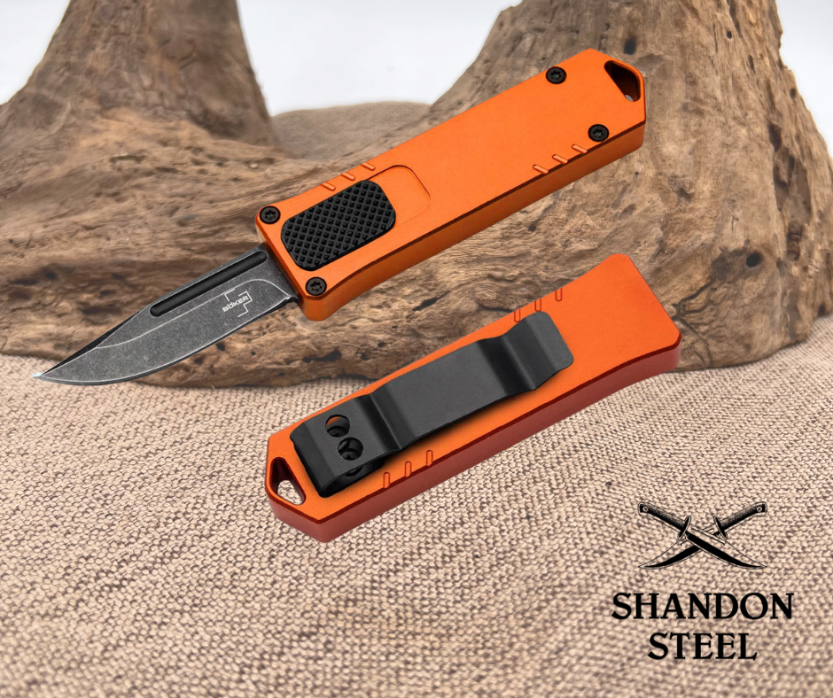 The revolution of evolution. As portable storage media, USB sticks have become an integral part of our everyday lives. The Boker Plus USB OTF 2.0 is an absolutely handy automatic knife that is strongly reminiscent of the characteristic design of common USB sticks. The knife now has a flat slider on the front of the handle, which allows the clip point blade made of edge retention D2 to pop out of the handle as quick as an arrow and disappear when pressed again. Thanks to the practical one-handed operation, small everyday cutting jobs can be completed in no time at all. The robust black stonewash finish of the blade harmonizes perfectly with the handle made from CNC-milled 6061-T6 aluminium. Thanks to the lanyard hole, the knife can also be ideally attached to a key ring, while the wide tip-down (r) clip allows the knife to be carried discreetly in a trouser pocket. With burnt orange handle.