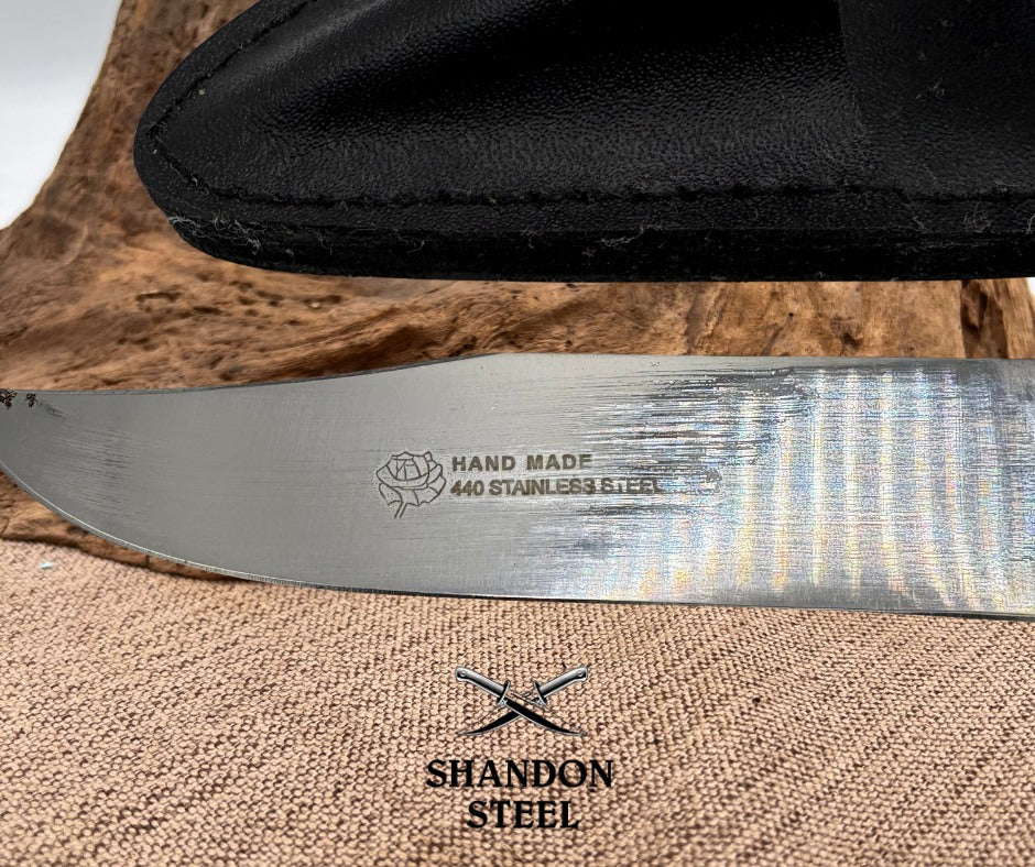 The Bone Two Piece 8.5" & 5.25" Hunting Knife Set with Leather Sheath RA-1012-A is a high-quality, modern fixed blade knife set perfect for hunting and outdoor activities. Made with stainless steel blades and full tang construction, these knives are designed for right-handed use with a clip point blade ideal for survival situations. The set includes a leather sheath for safe storage and transport, and the bone handles add a touch of authenticity to this reproduction knife set. Made in Pakistan, this knife set is a must-have for collectors and outdoor enthusiasts alike. These knives are new old stock. They come with the original sheath and box.