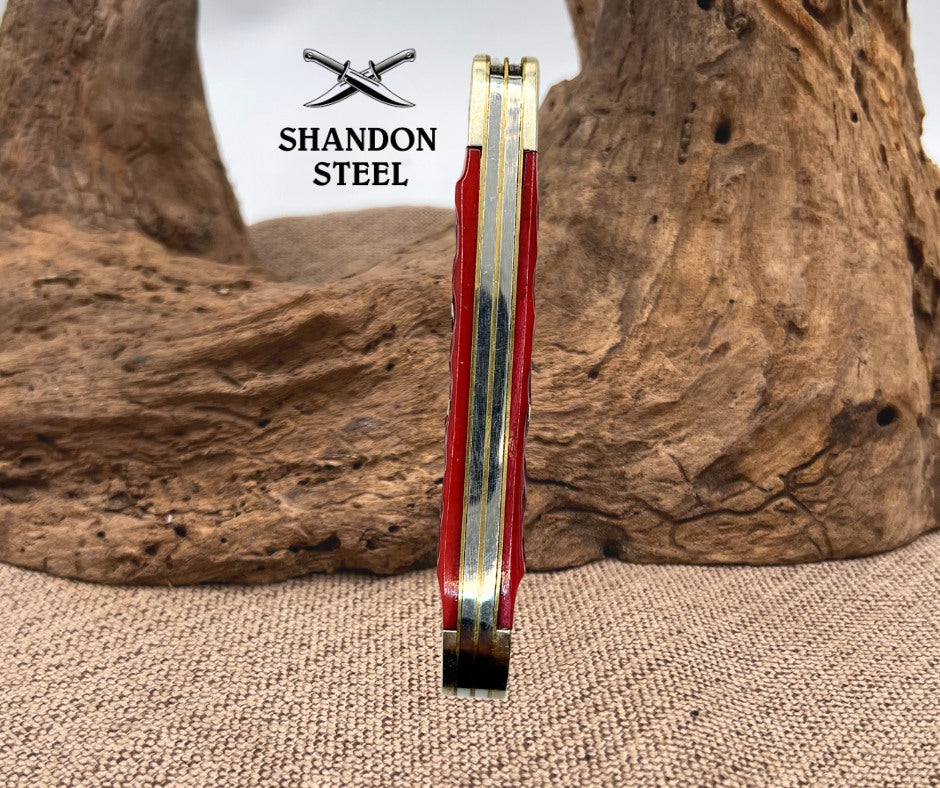 The Buck Creek German Stainless Red Bone Trapper is a vintage folding pocket knife with a classic clip point blade made of stainless steel. This ambidextrous knife features a manual opening mechanism and a slipjoint lock type. The red handle is made of bone, adding a touch of elegance to this original two-blade pocketknife from Buck Creek. Perfect for collectors or everyday carry, this piece is sure to be a standout in any knife collection. Measures 4-1/8" closed.