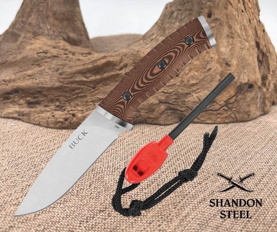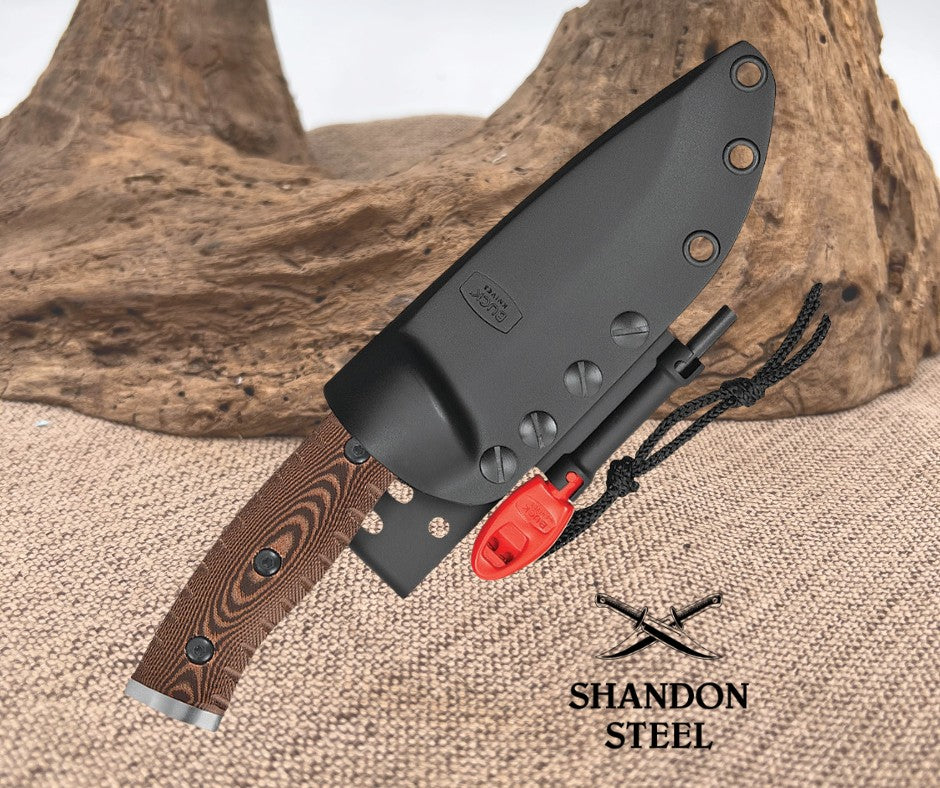 9 1/2" overall. 4 5/8" 420HC stainless blade. Full tang. Brown and black CNC contoured micarta handles with steel bolster guard and pommel. Pommel can be used as an improvised hammer. Injection molded black nylon sheath can be configured for horizontal or vertical belt carry. Attached to the sheath is a Ferrocerium fire starter/safety whistle.