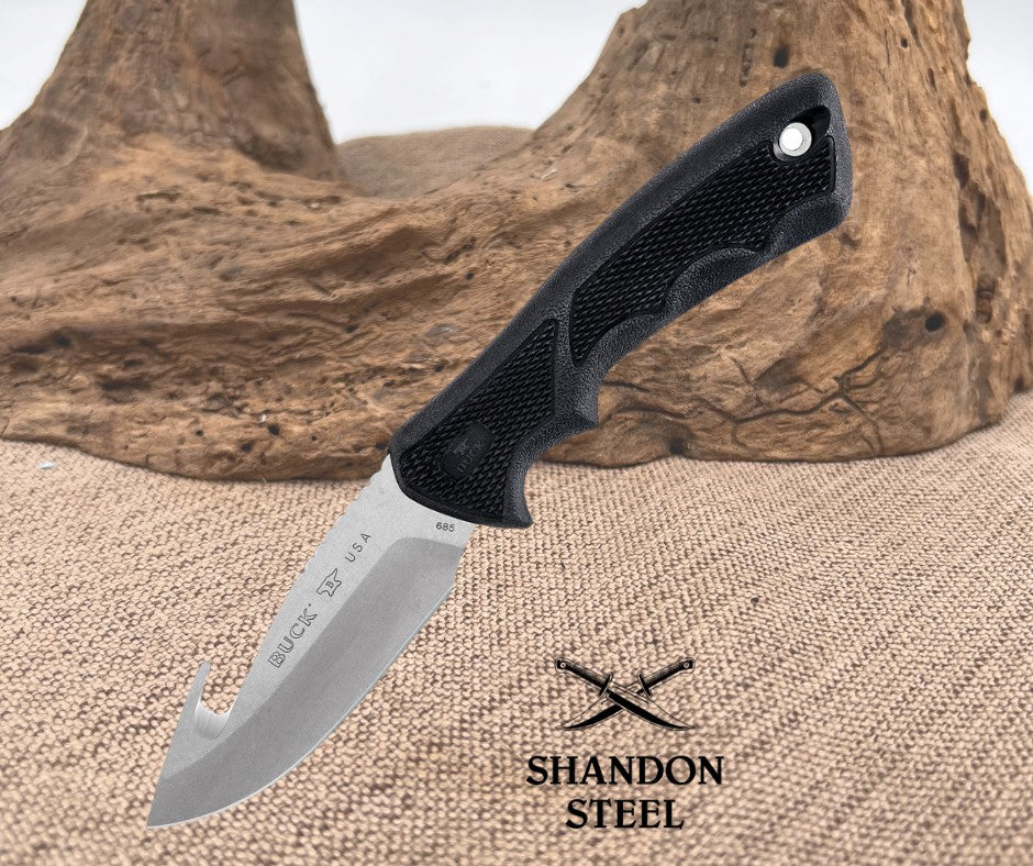 - 8.88" overall. 4" satin finish 420HC stainless guthook blade. Lanyard hole. Black Dynaflex rubber handle. Black nylon belt sheath. Boxed.