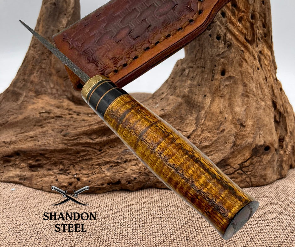 The Burr Oak USA Handmade Damascus Clip Point Custom Knife is a high-quality, ambidextrous hunting and everyday carry knife crafted in the United States. The blade is made of Damascus steel with a length of 3.75", featuring a drop point design and a plain edge. The handle is made of wood, and the knife comes with a leather sheath for easy carrying. This original custom knife is a testament to fine craftsmanship and attention to detail, making it a valuable addition to any knife collection. The leather sheath included adds a touch of authenticity to this custom-made tool, making it a must-have for knife enthusiasts and outdoor enthusiasts alike. Handmade in the United States by Burr Oak, this original piece is sure to be a standout addition to any collection of collectible knives. Mark has been a full-time blade smith since 1998 and has been making knives part-time since 1988. He makes both folders and fixed blades in his shop located in Owosso, MI. Mark was also a Forged in Fire participant on season four.