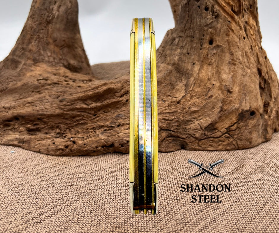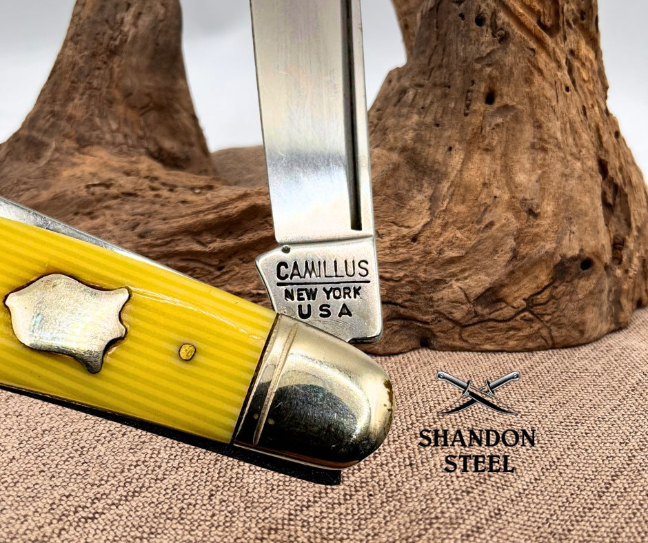 The Vintage Camillus 66 Stockman French Celluloid Scales pocket knife is a collectible folding knife made in the United States. With a carbon steel blade ranging under 2.75 inches, this ambidextrous pocketknife features ivory celluloid scales and three different blade types: clip point, sheepsfoot, and spear point. The manual opening mechanism and slipjoint lock type add to its vintage charm, making it a valuable piece for knife collectors and enthusiasts. Measures 3-7/8" closed.