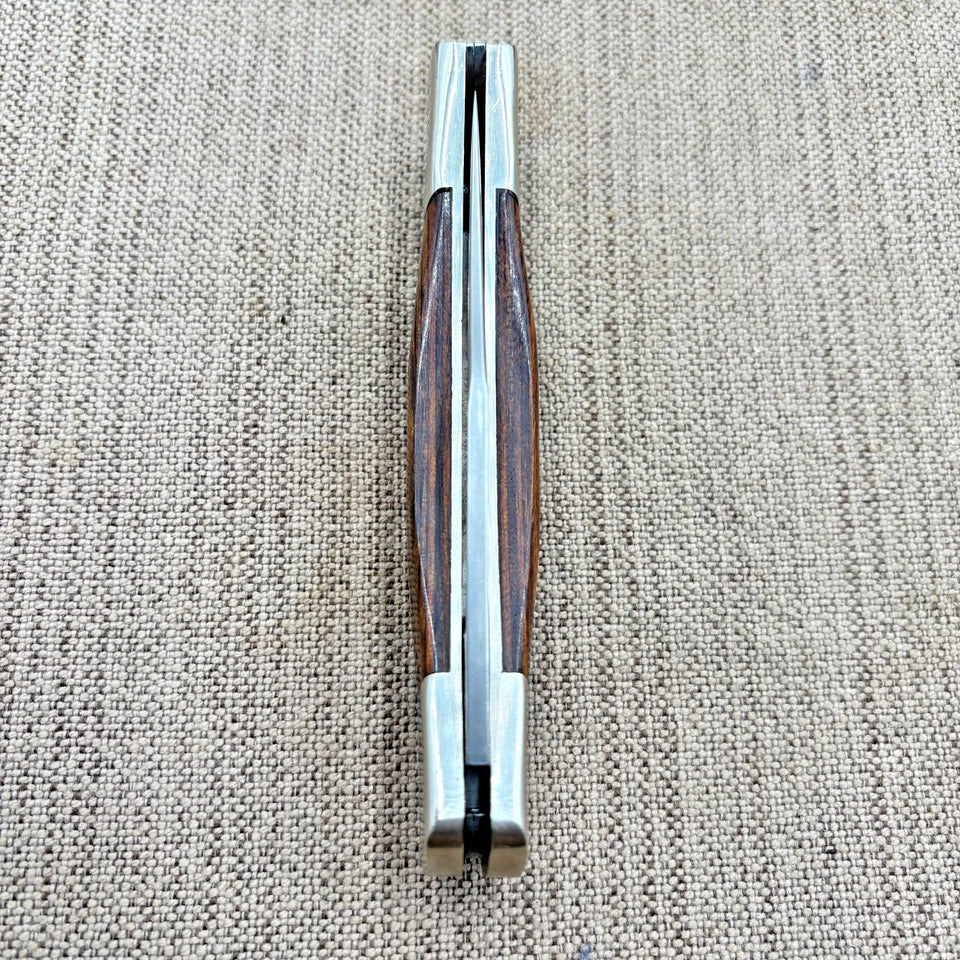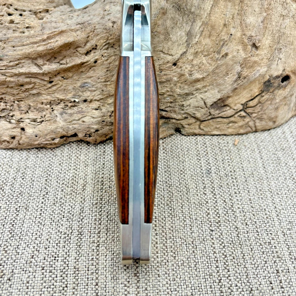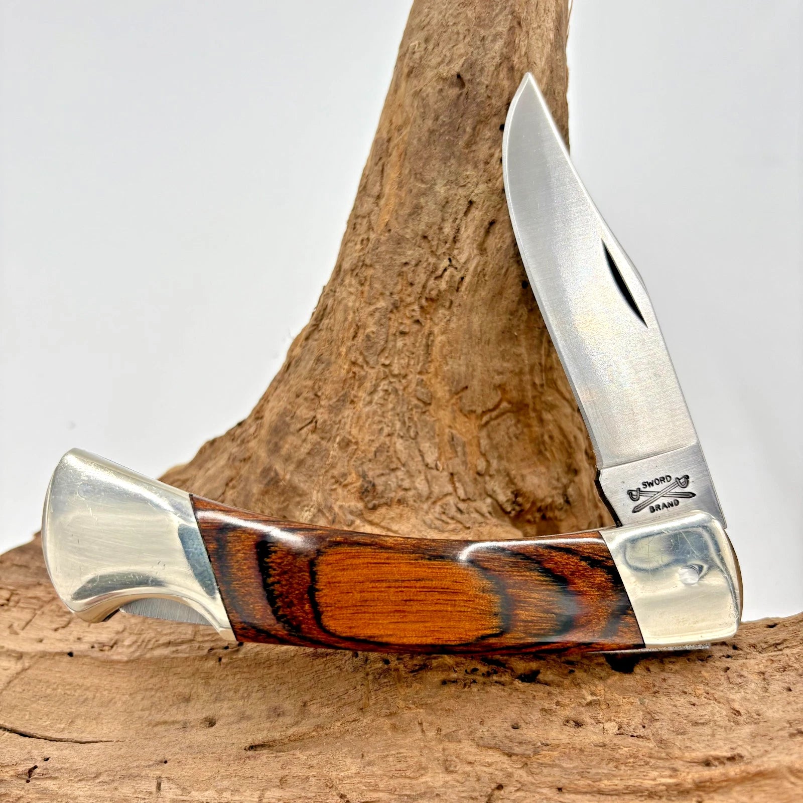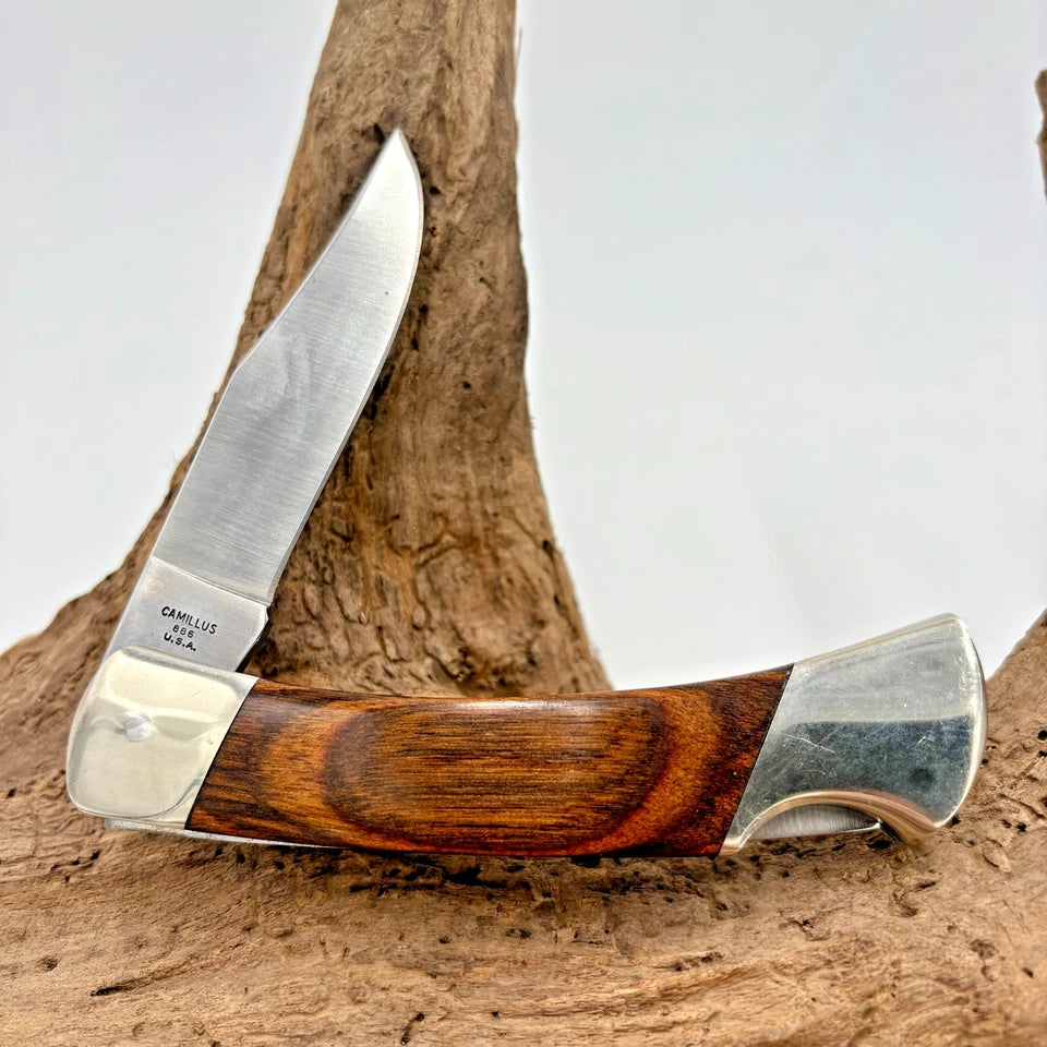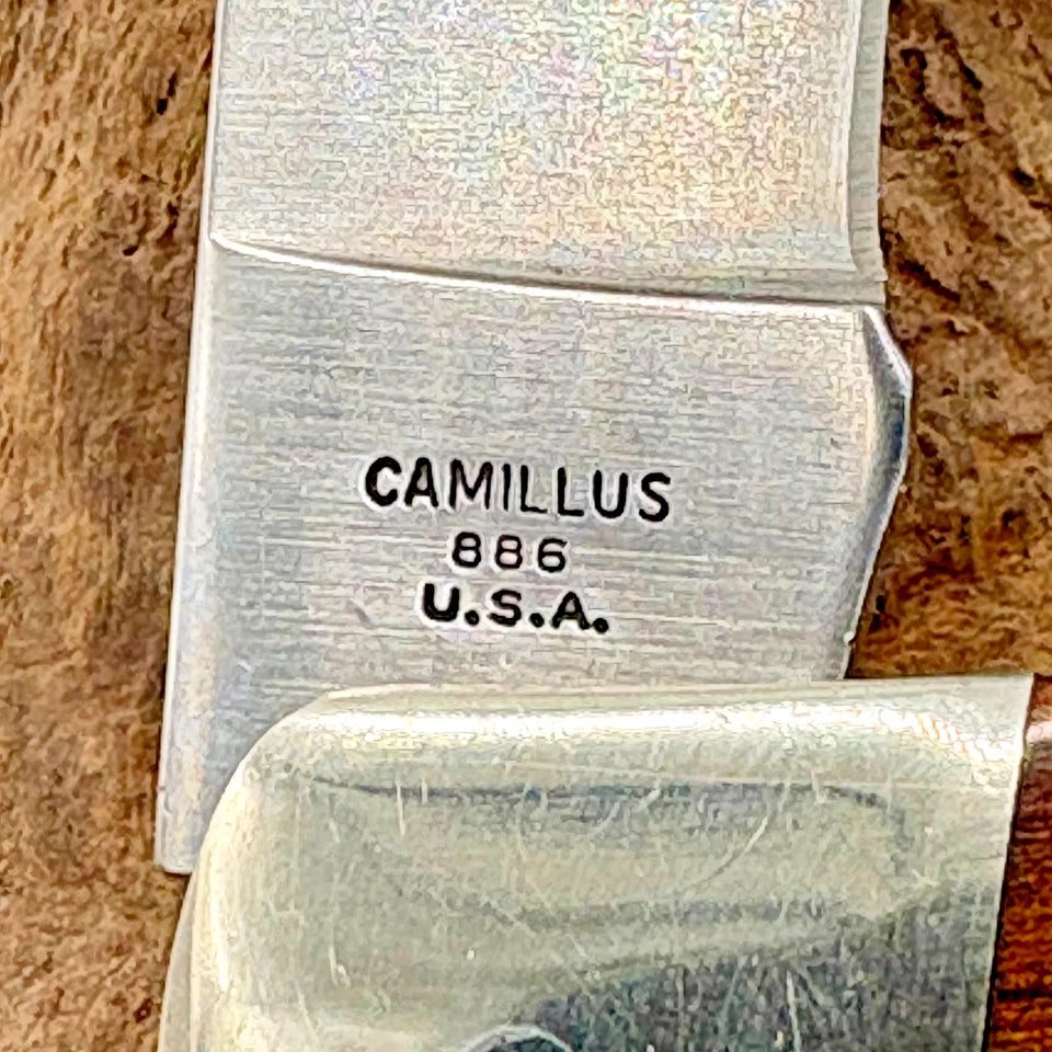 The Camillus 886 Folding Hunter Lock Back Folding Knife is a vintage collectible made in the USA. It features a stainless steel clip point blade with a brown handle made of wood. This ambidextrous pocketknife has a manual opening mechanism with a lockback function, making it safe and easy to use. With a blade range of 2.76 - 4 inches, this original piece from Camillus is a unique and valuable addition to any collection of vintage folding knives.