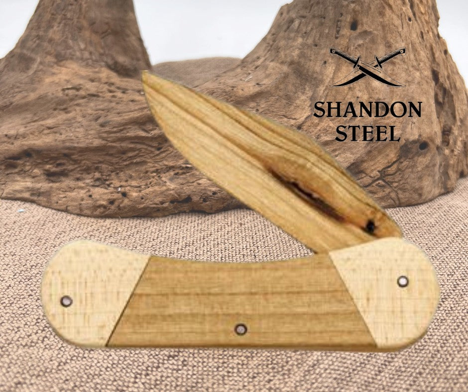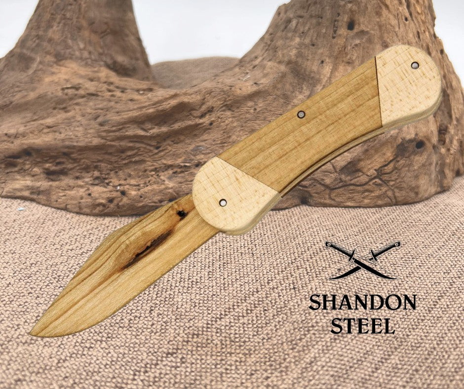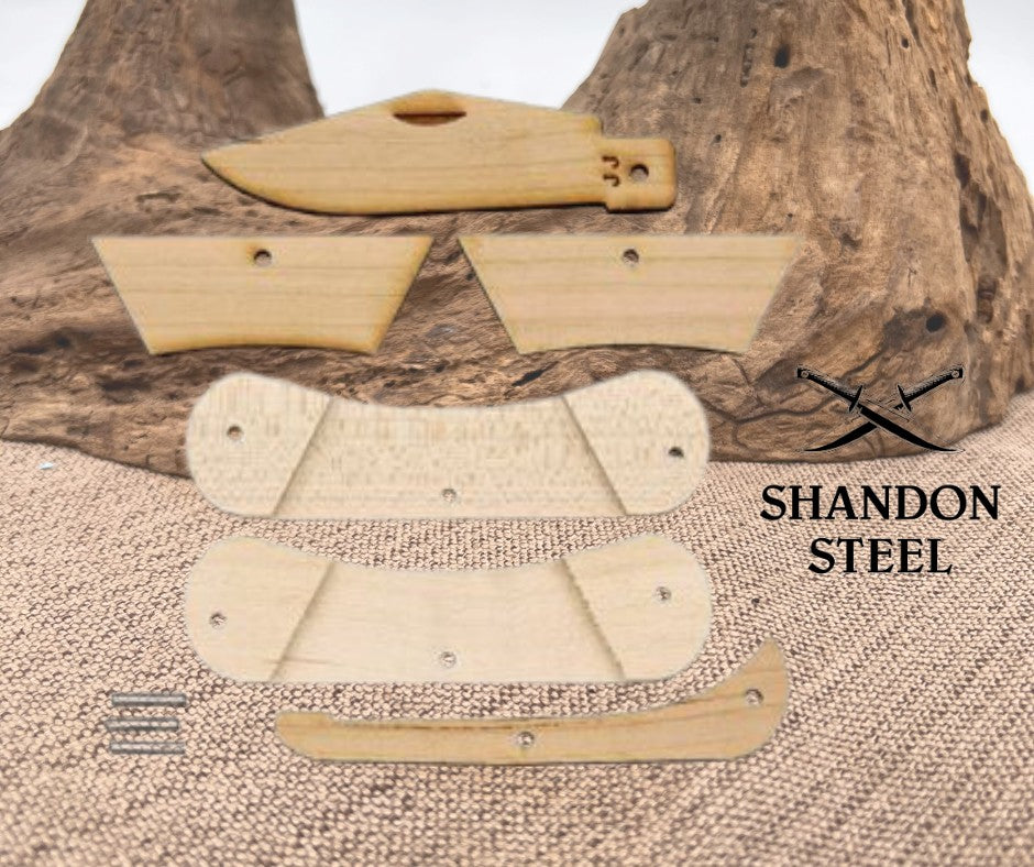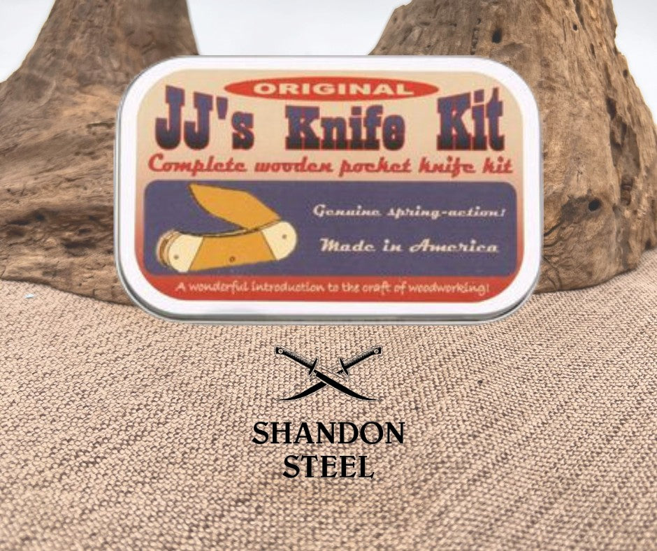 These kits were first put together by a woodworking hobbyist as a Christmas gift for his son J.J. The pieces are hand cut and hand packaged in the USA. Each kit features six pieces cut from American hardwood; three metal pins; instructions; and metal storage tin. Blade(s) are unsharpened. Finished knife size is 3 1/2" closed. Contains small parts, keep away from small children. This kit makes one single blade canoe. Great gift idea!