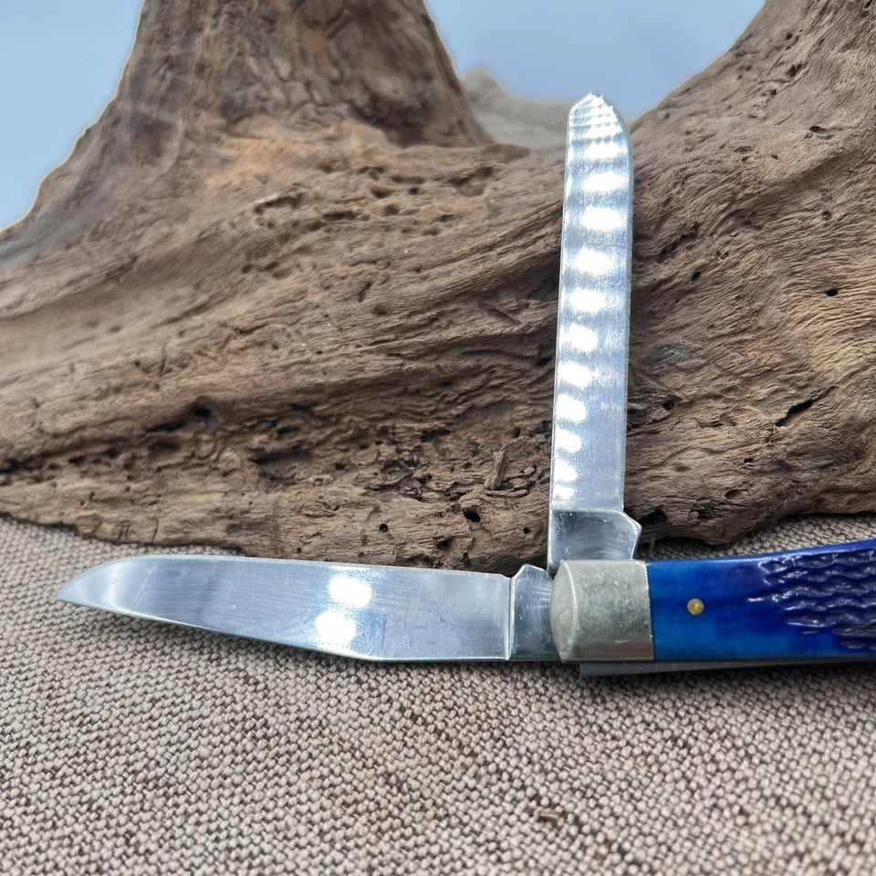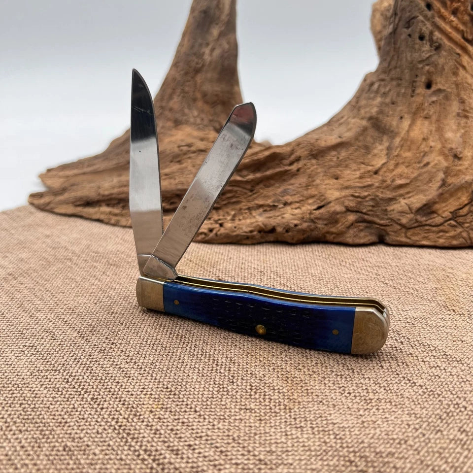 This Case XX folding knife is a must-have for any collector or outdoor enthusiast. The Caribbean Blue color and stainless steel blade material make it a stylish and durable choice. With a blade range of 2.76 - 4in. and clip and spey point blade type, this knife is perfect for a variety of tasks. The manual opening mechanism and slip joint lock type ensure safety and ease of use. This knife is an original, factory-manufactured piece and comes with a sheath. Whether you're using it for camping, fishing, or everyday use, this knife is sure to impress. 4-1/8" closed.