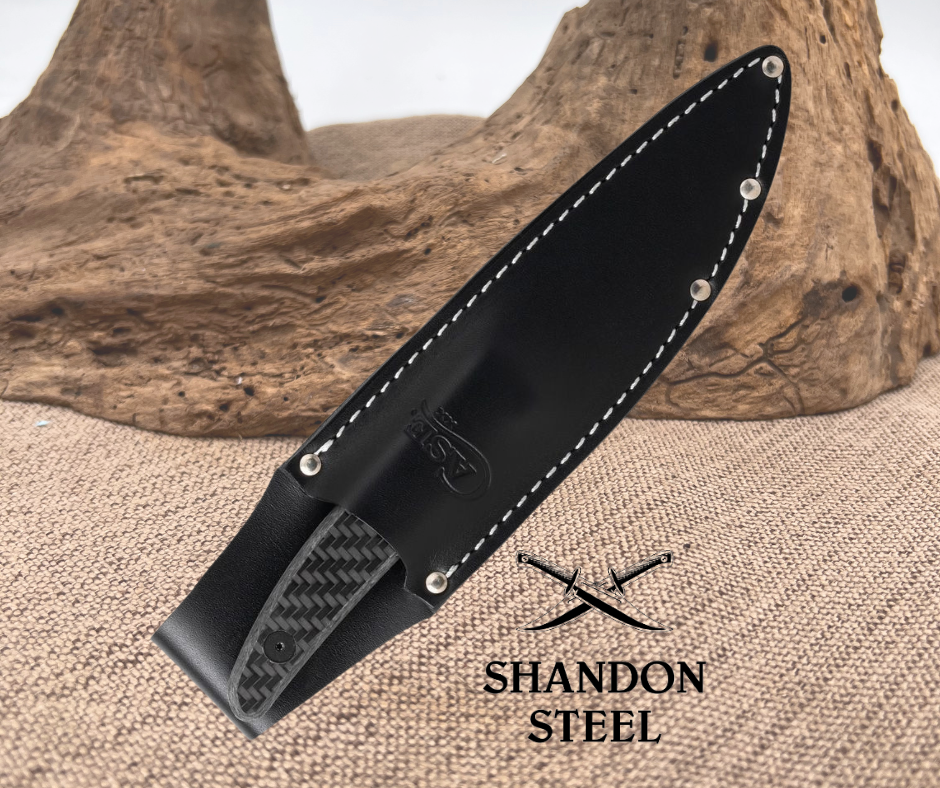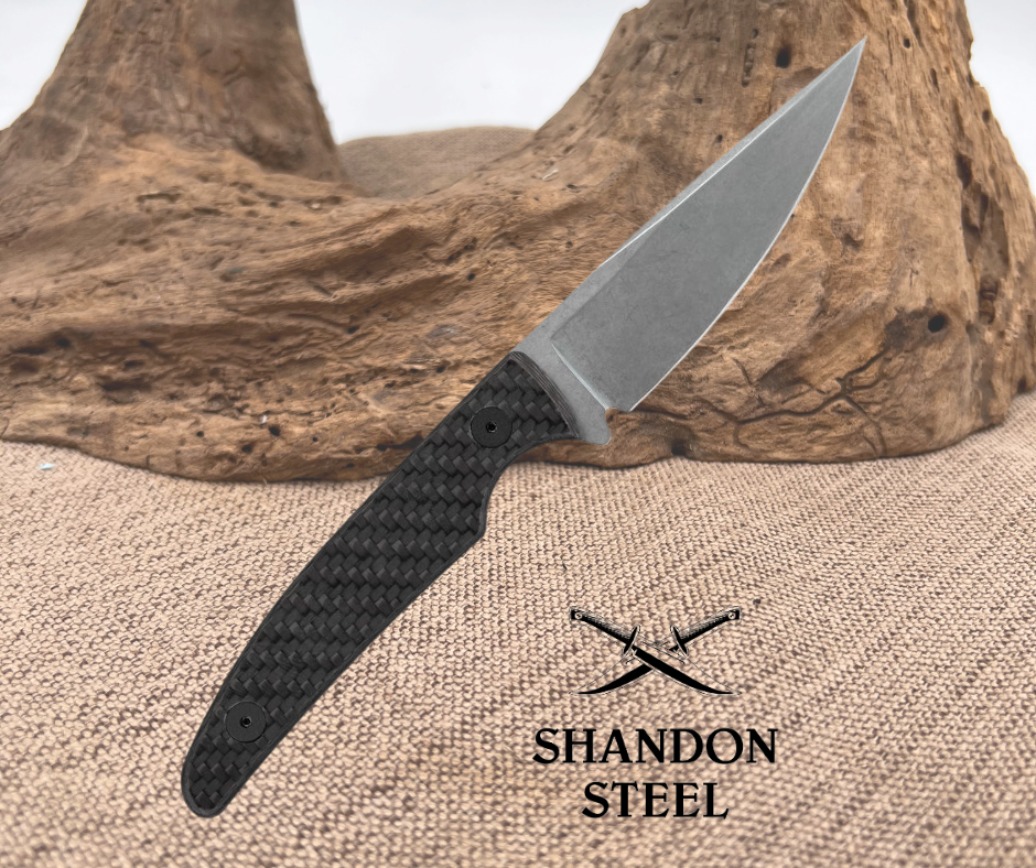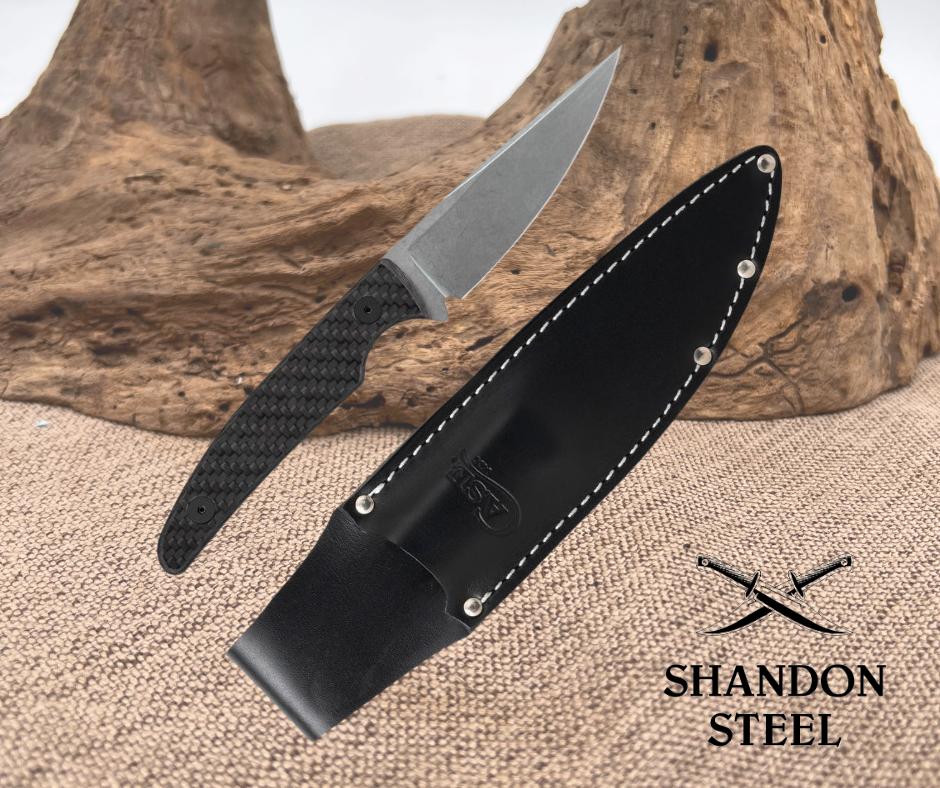8" (20.32cm) overall. 3.75" (9.53cm) stonewash finish S35VN stainless spear point blade. Carbon fiber handle. Full tang. Black leather belt sheath. Boxed.