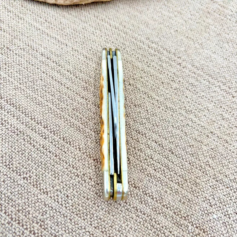 This Case XX Med Stockman Knife 6318 Jigged Amber Bone Stainless Pocket Knife is a perfect addition to your collection. With a stainless steel blade material and a slipjoint lock type, this ambidextrous pocket knife is both durable and safe to use. The blade range includes a 1.88 in Sheep Foot, 2.57 in Clip, and 1.71 in Spey, all with a plain edge and a clip point, sheepsfoot, and spey point blade type. The handle material is made of jigged amber bone, giving it a unique and beautiful appearance. The opening mechanism is manual, and the knife includes three blades. This original, United States-made pocket knife is part of the Stockman product line and was produced in 2018. Measures 3-5/8" closed.