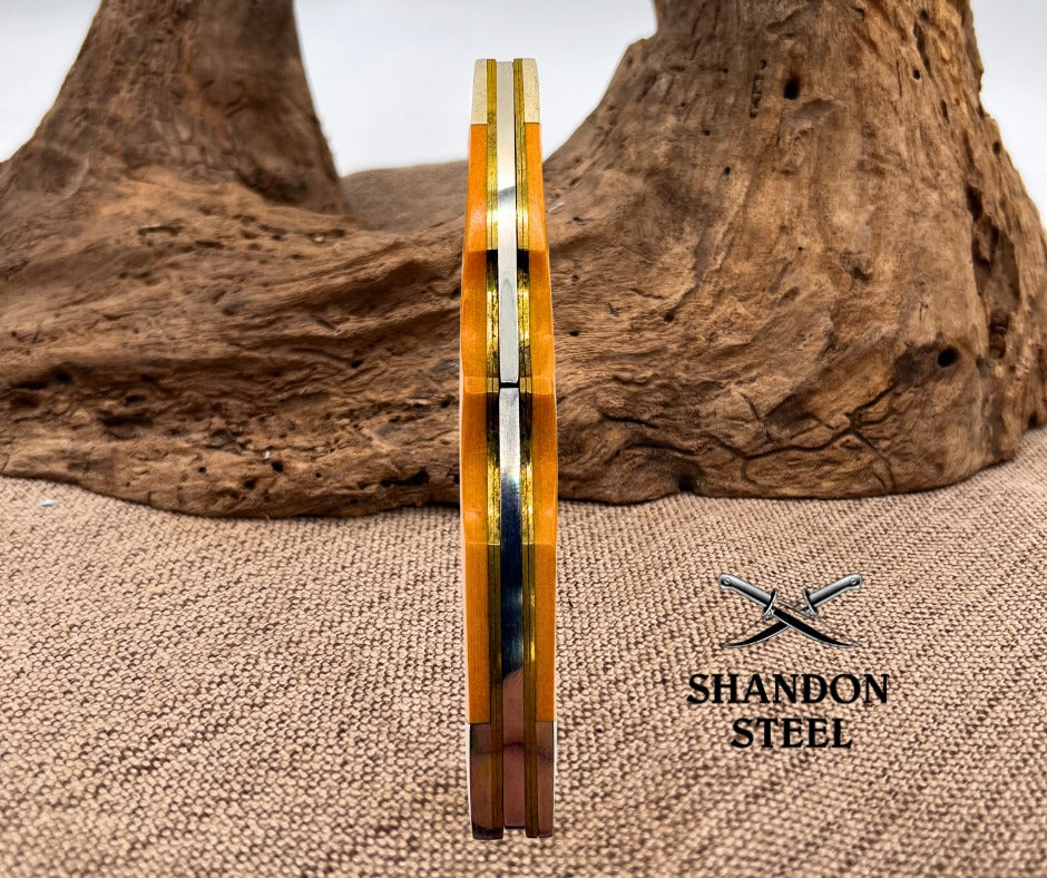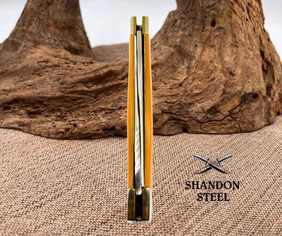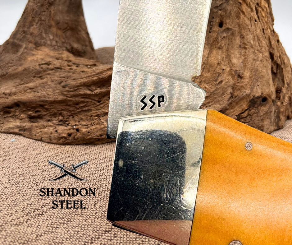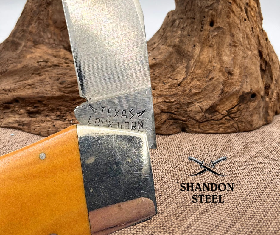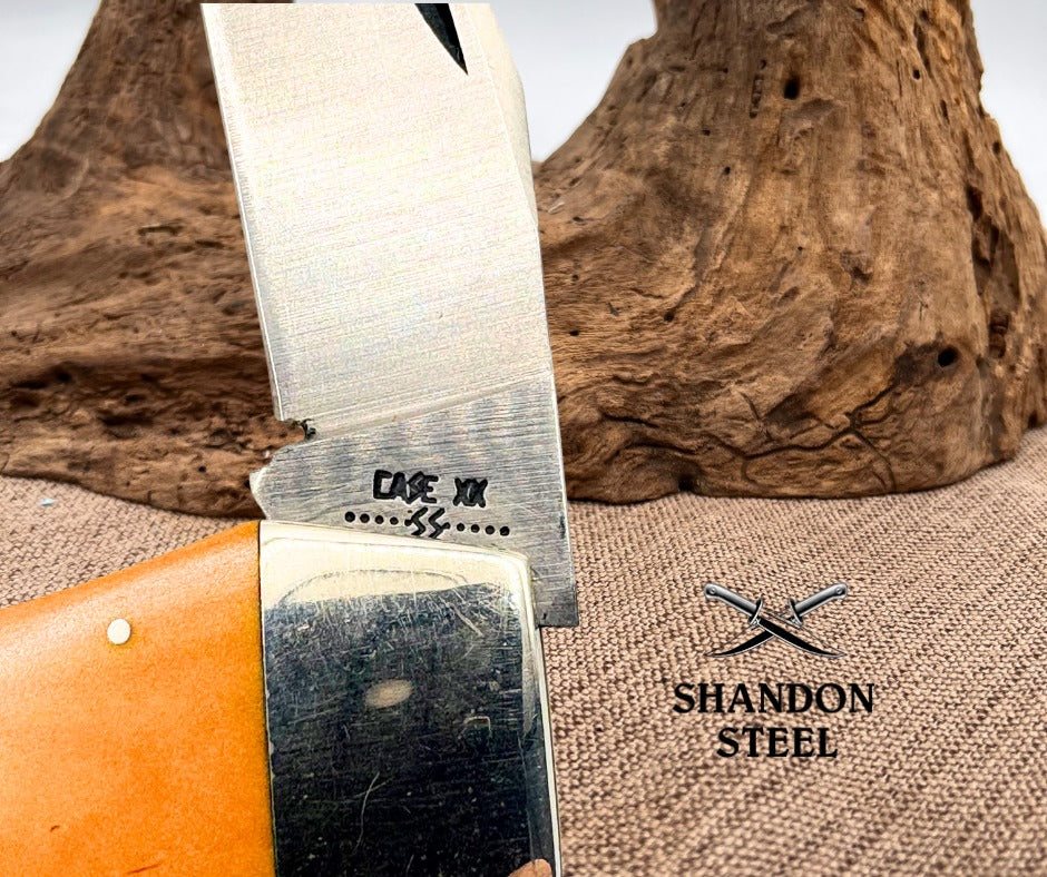 The Case XX USA Vintage 1980 10-Dot Texas Lockhorn Double Lockblade Pocket Knife is a collectible folding knife with a clip point blade. Made in the United States, this original pocket knife features a manual opening mechanism and a lockback design. The yellow handle and plain blade edge add to its vintage appeal, making it a sought-after piece for collectors of vintage folding knives. With two blades and a blade range of 2.76 - 4 inches, this pocket knife is a unique and valuable addition to any collection. Measures 4.5" closed.