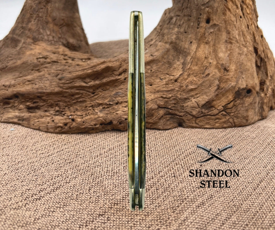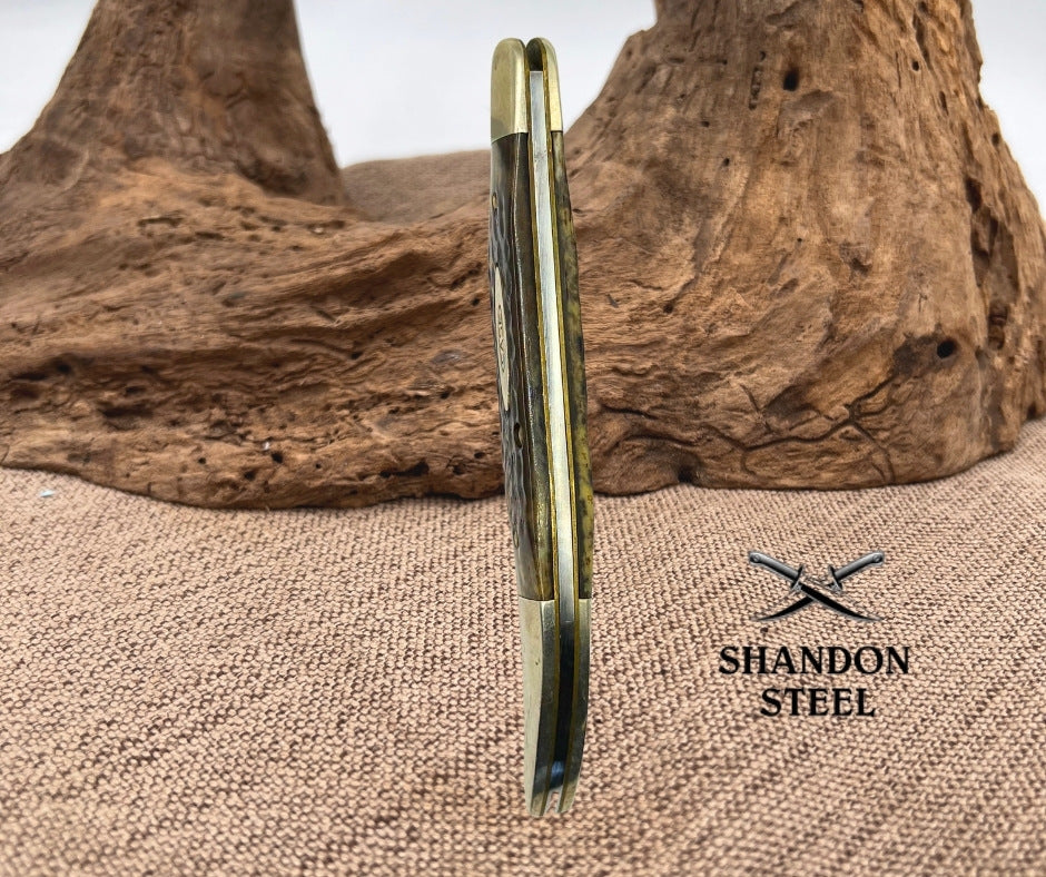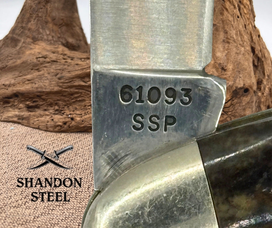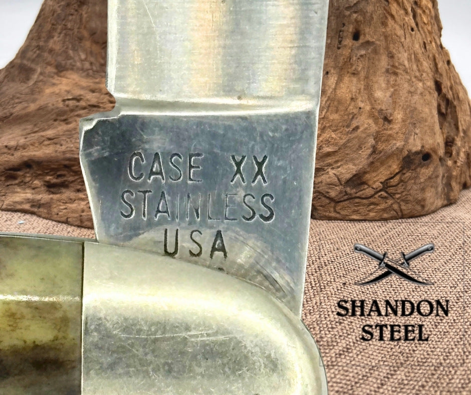The Case XX USA Vintage 5" Toothpick Pocket Knife from 1979 is a collectible folding knife with a 1-blade design featuring a clip point blade. Made in the United States, this pocket knife has a brown handle made of bone and a slipjoint lock type for easy opening and closing. This vintage piece is a classic addition to any knife collection, showcasing the craftsmanship and quality associated with the Case XX brand. The Dots are concealed by the bolster, I can only see one but there may be more??? Good snap, no wobble, scuffs on blade.