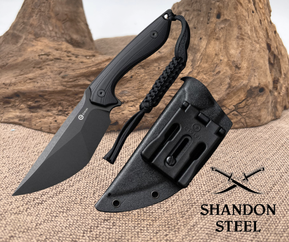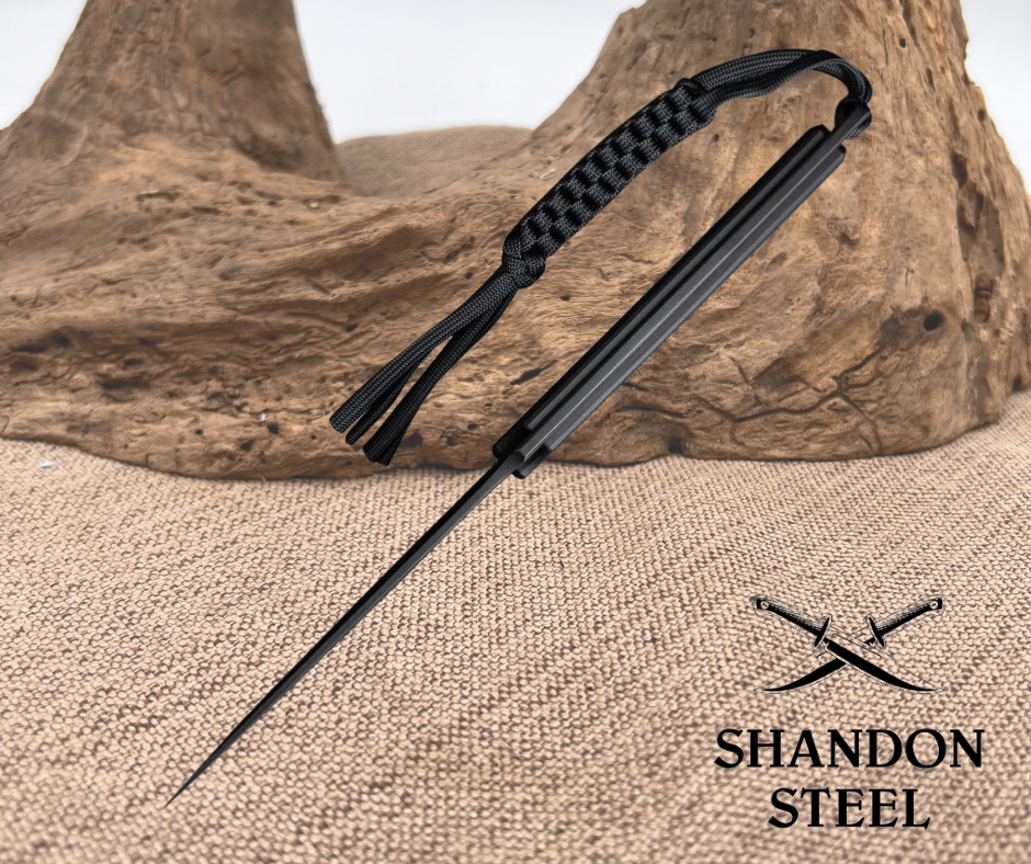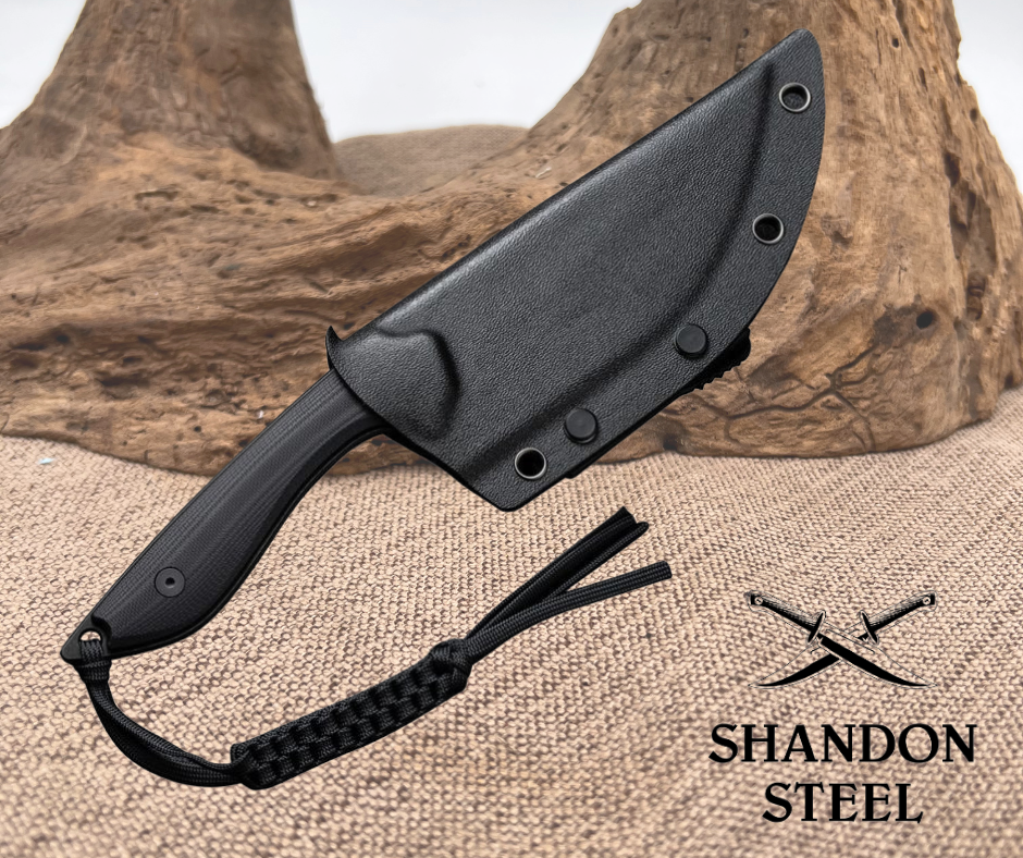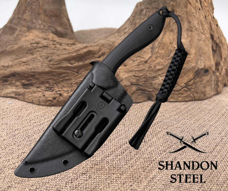 9.88" (25.1cm) overall. 4.88" (12.4cm) black stonewash finish D2 tool steel modified tanto blade. Black G10 handle. Full, extended tang. Lanyard hole. T-Clip. Braided paracord lanyard. Black Kydex belt sheath. Designed by Bob Terzuola. Boxed.