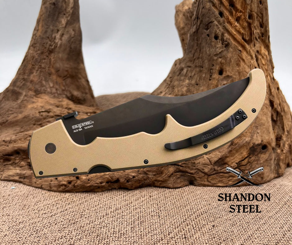 The Cold Steel XL Espada Lockback Folding Knife features a 7.5" stainless steel blade with a trailing point style, housed in a brown G10 handle. This ambidextrous pocketknife has a manual opening mechanism and a lockback design for safety. Weighing 1.02 lb, this collectible folding knife is part of the Military product line and is an original Cold Steel creation made in Taiwan. Ideal for everyday carry and utility purposes, this modern folding knife is a reliable and durable tool for various tasks. 9.25" (23.5cm) closed. 7.5" (19.05cm) black finish AUS-10A stainless blade. Dark Earth G10 handle. Thumb disk. Pocket clip.