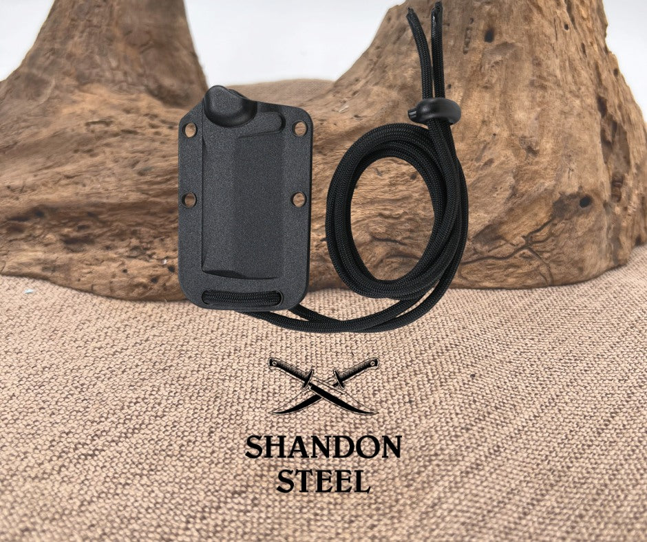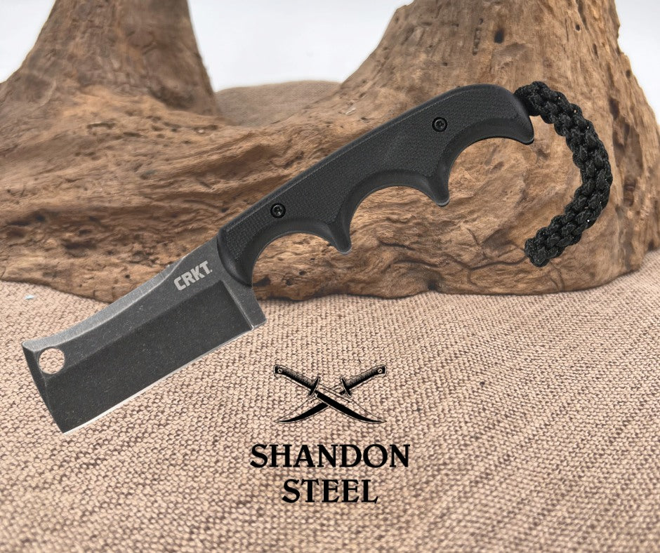 5" (12.7cm) overall. 2.13" (5.41cm) black stonewash finish 5Cr13MoV stainless cleaver style blade. Black finger grooved G10 handle. Black paracord lanyard. Black thermoplastic belt sheath. Designed by Alan Folts. Boxed.