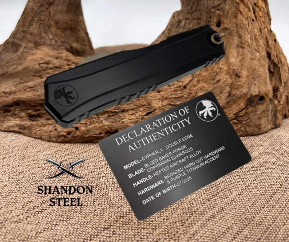 Cypher® II - Double Edge Marfione Select Blued Baker Forge Coppermai Damascus Hefted Alloy Bronzed Hard Cut Hardware & Purple Titanium Accent
