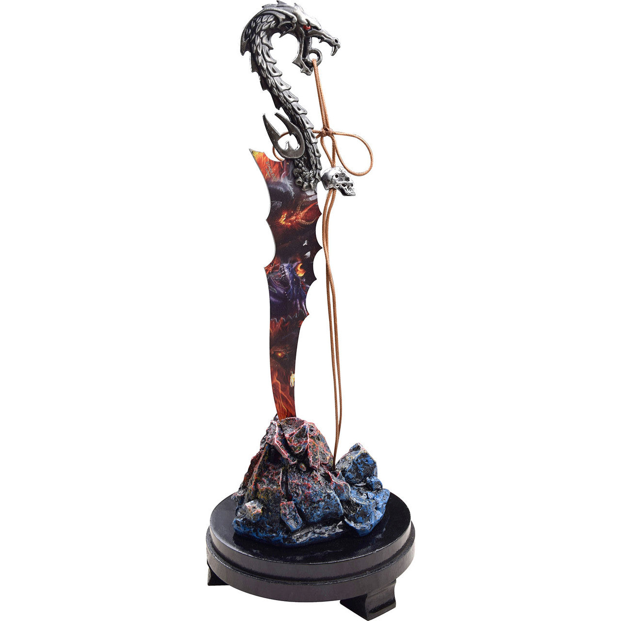 - SPECIAL FEATURES: The Dragon King - Fantasy Dragon Knife with Display: Stainless Steel Blade with Printed Dragon Design, Sculpted Zinc Alloy Dragon Handle with a Skull Trinket. This Knife Comes Complete with a Wood Display Stand.