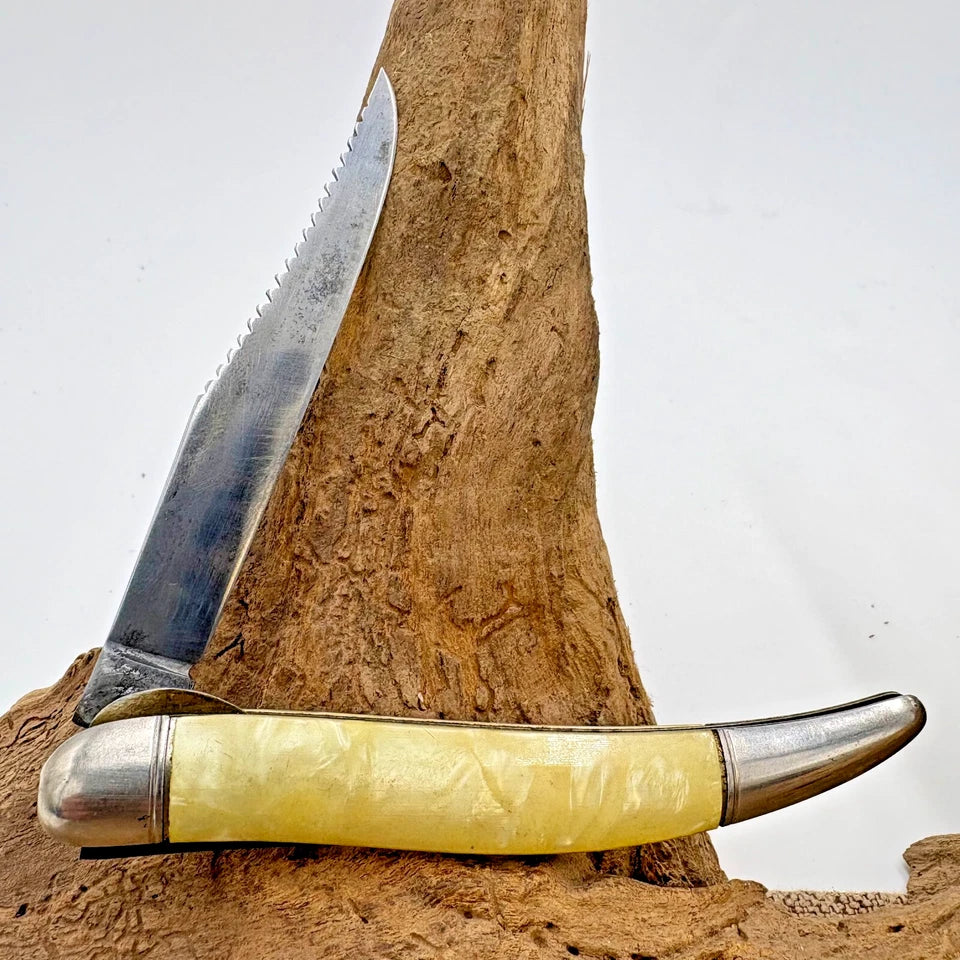 The Imperial Hammer Brand USA Vintage Tackle Box Folding Fishing Fillet Knife is a unique collectible piece with a 2.76 - 4 inch carbon steel blade featuring a clip point. The knife has an ambidextrous design with a manual opening mechanism, making it convenient for everyday use. The yellow handle is made of plastic, adding a retro touch to this original United States-made pocketknife. This slipjoint knife includes a fish scaler tool, making it a versatile and functional addition to any fishing enthusiast's collection. Measures 5" closed.