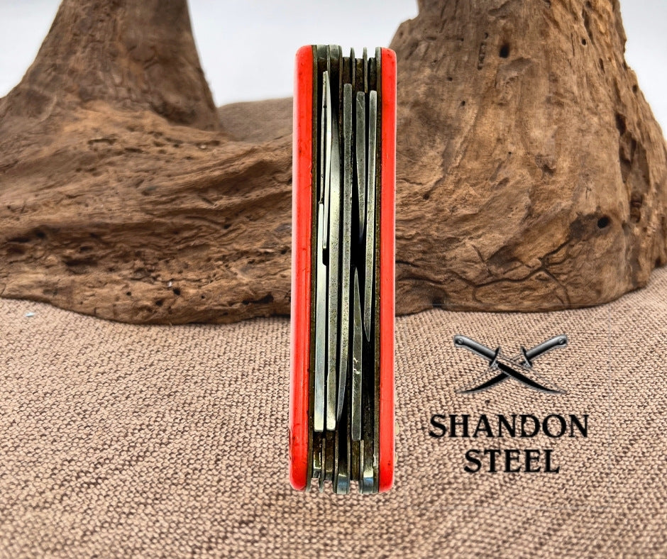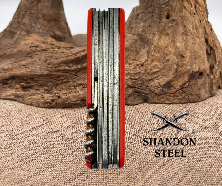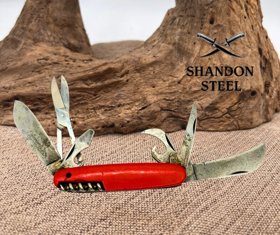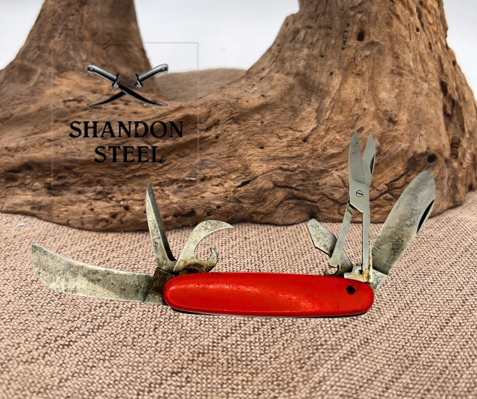 The Imperial Ireland Multi Function Pocket Knife is a vintage collectible folding knife with a 4'' carbon steel blade and a variety of tools such as scissors, punch, corkscrew, screw driver, saw, and bottle opener. The knife features a red plastic handle, manual opening mechanism, and a slipjoint lock type. Made by Imperial, this ambidextrous pocketknife has more than 4 blades and is a unique piece originating from Ireland. Missing bail and spring on scissors.