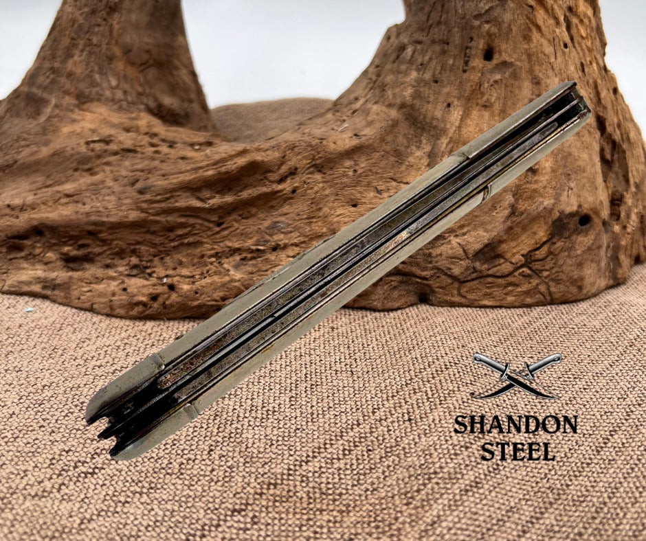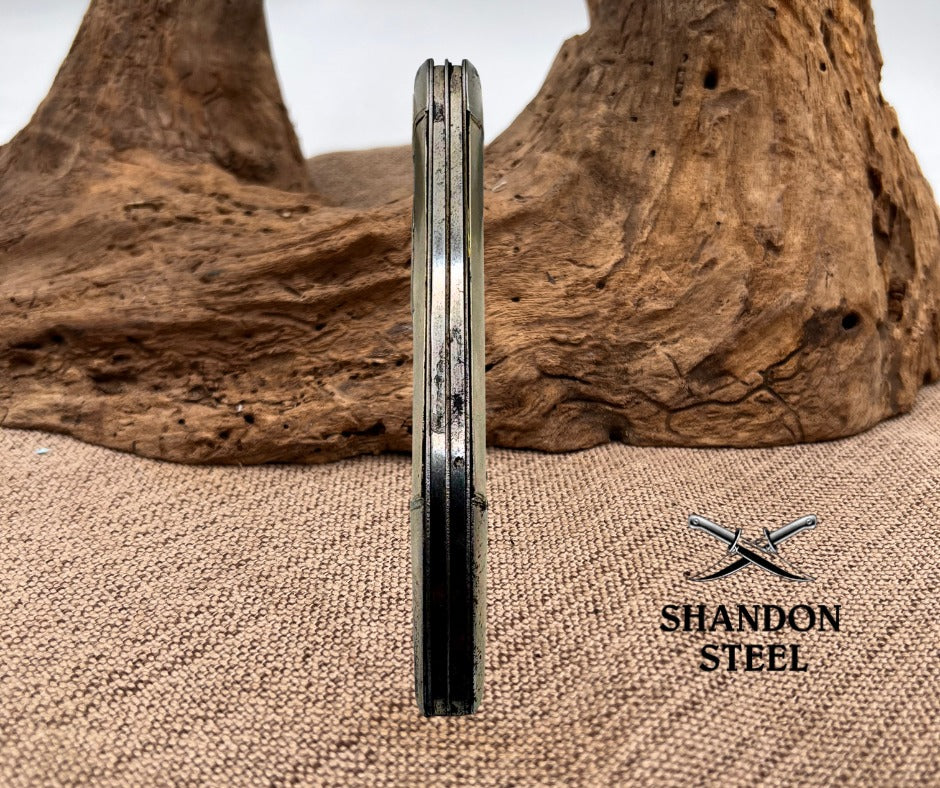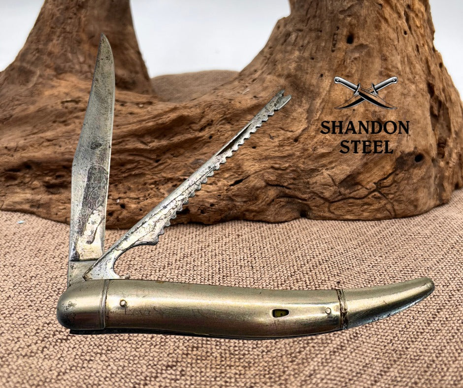 The Imperial USA Vintage Fishing Folding Pocket Knife is a versatile tool perfect for fishing enthusiasts. Made with carbon steel blades and stainless steel handles, this pocket knife features a clip point blade ideal for hook removal. With a manual opening mechanism and a slipjoint lock type, this ambidextrous knife is both practical and reliable. The vintage design adds a touch of nostalgia to this collectible piece, making it a must-have for collectors of vintage folding knives. Made in the United States, this pocket knife is both functional and historically significant. Measures 5" closed, good snap, scuffed blades, missing finish on handles.