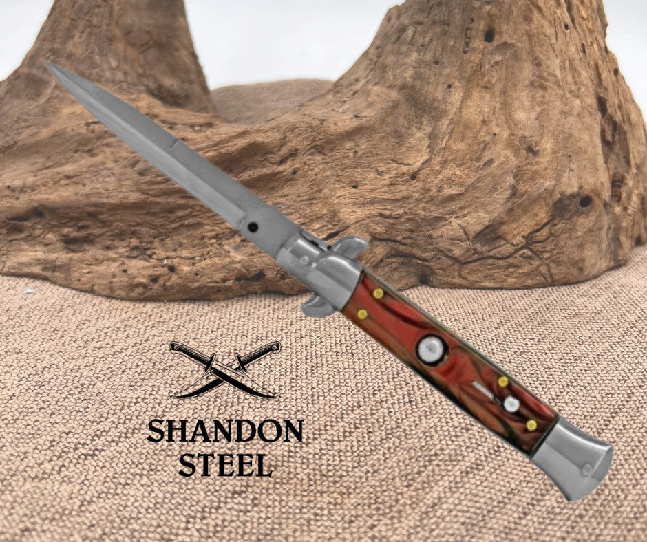 This 9" Italian Style Stiletto features a red swirl handle and a bayonet blade with a polished finish. The automatic knife is a budget version of the popular Italian stiletto automatic knife. Its handle is outfitted with stainless steel bolsters, push button, and sliding safety. Brass pins and steel liners add a classic touch to the design. The 440 stainless steel blade comes in a polished finish with a plain edge. This knife offers everything you love about Italian stilettos without the imported price tag. Comes with black nylon sheath.