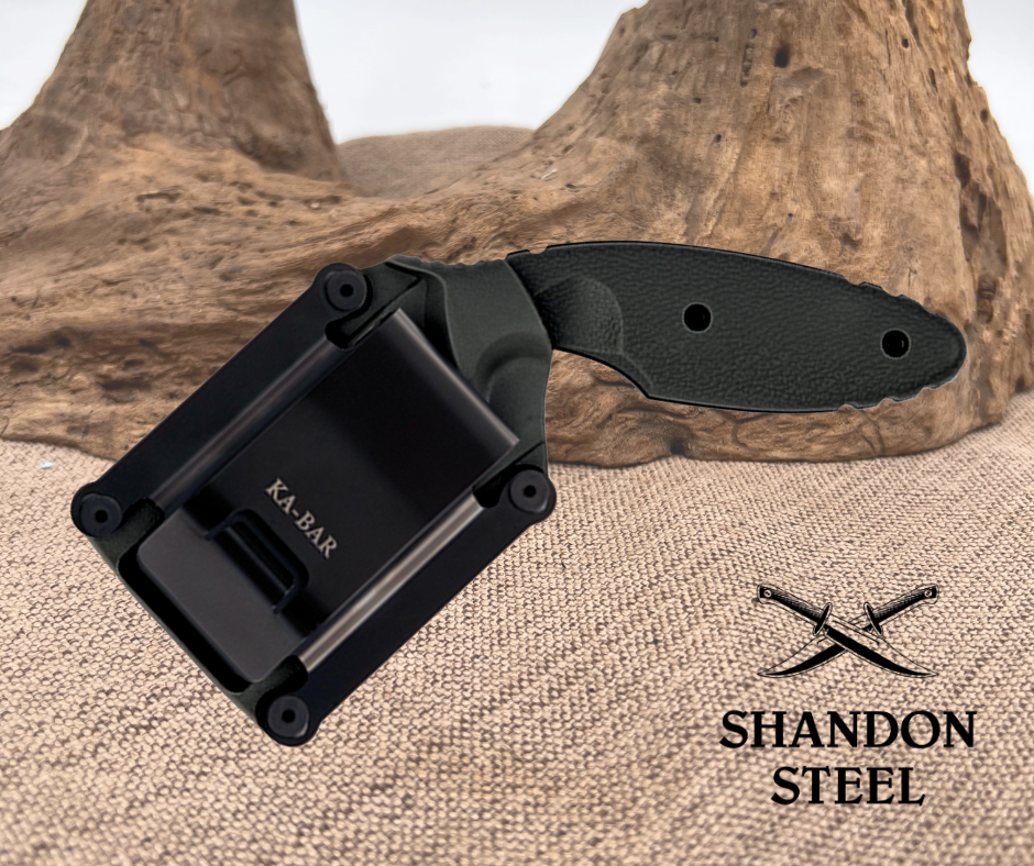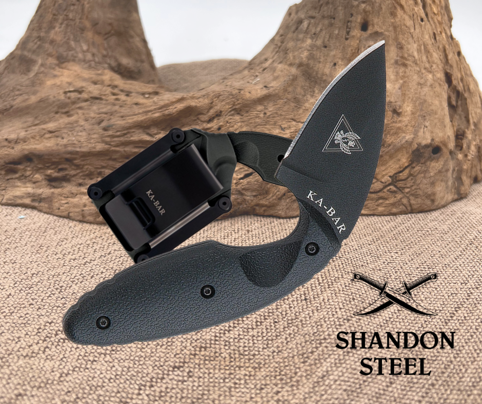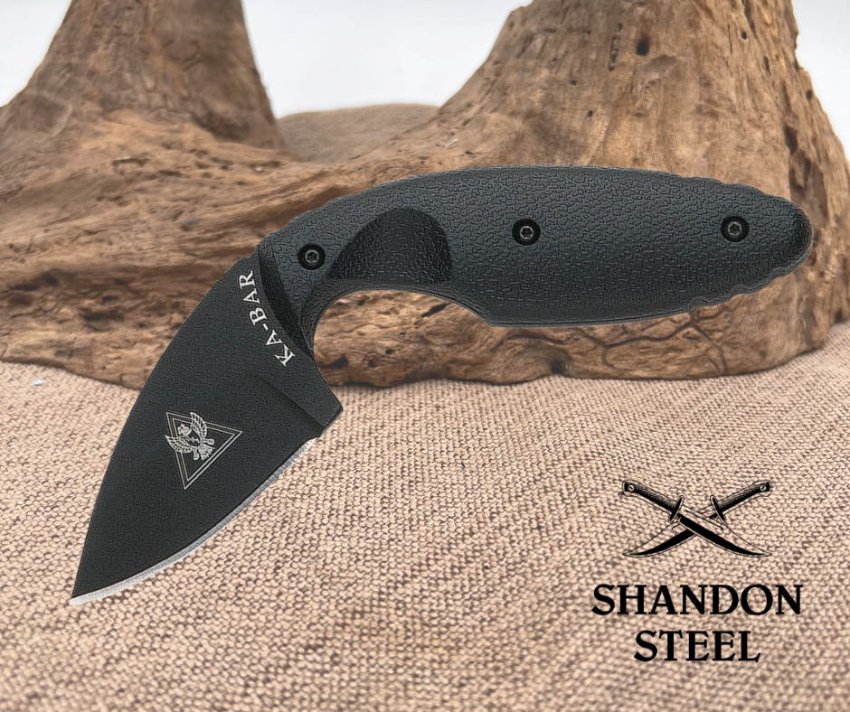 5 5/8" overall. 2 3/8" black powder coated AUS-8A stainless drop point standard edge blade. Full tang. Black textured Zytel handles. Black glass filled nylon belt sheath. The TDI Law Enforcement Knife was designed to be used as a "last option" knife. In extreme close quarters encounters where a suspect is attempting to take an officer's handgun, or the officer cannot access his/her handgun, the TDI knife is available. Designed as an "off hand" knife that draws like a pistol, the reversible sheath can be worn on either the right or left side of the officer's belt.