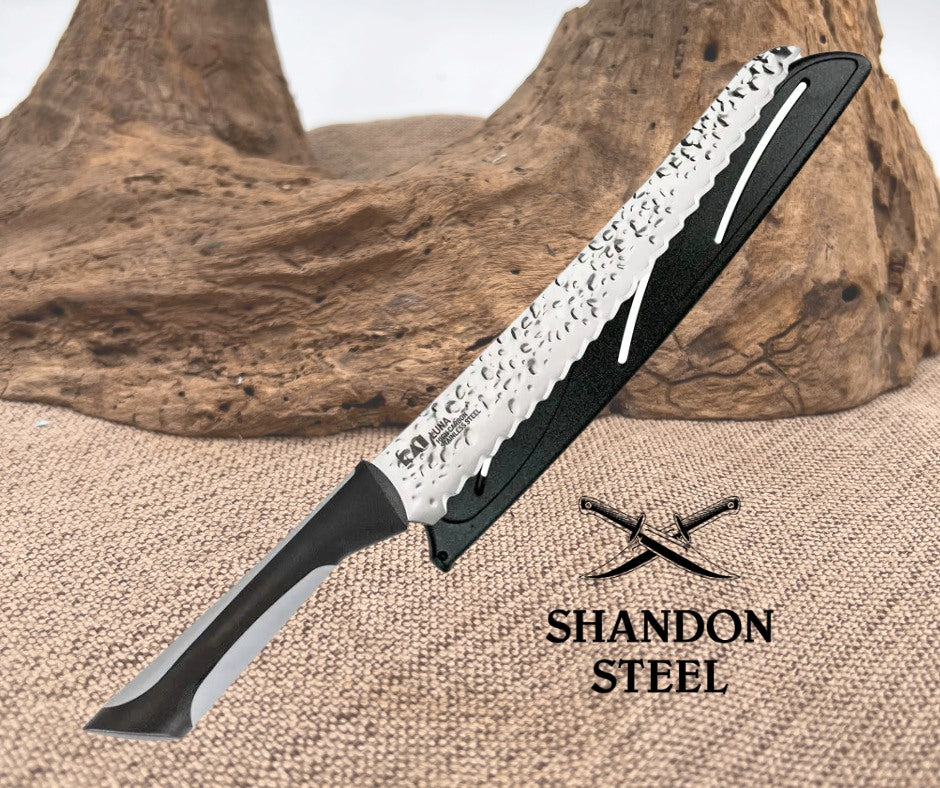 The Kai USA Luna Bread Black & Gray Hammered Finish Stainless Kitchen Knife 7062 is a high-quality and authentic collectible fixed blade knife. With a full stainless steel blade and a sleek black synthetic handle, this ambidextrous bread knife features a serrated edge and a hammered finish for added style. Made by Kai USA, this original kitchen knife is perfect for cutting and serving bread with ease and precision. Whether for culinary use or display, this modern fixed blade knife is a must-have for any knife enthusiast. 13.5" overall. 8.5" hammered finish serrated stainless blade. Black and gray rubberized synthetic handle. Hand washing and drying recommended. Black synthetic sheath.