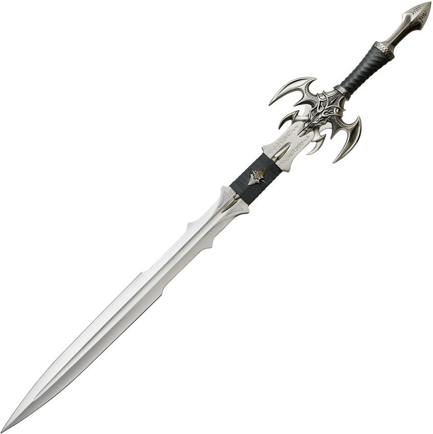 44.75" (113.67cm) overall. 28.75" (73.03cm) 420J2 stainless blade. Black leather wrapped handle. Finely detailed cast metal hilt with antique finish. Leather wrapped blade grip. Certificate of Authenticity. Includes art print hand signed by Kit Rae. Boxed.