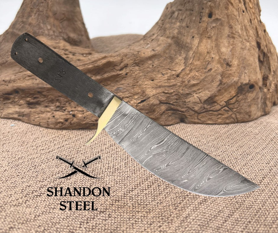 The product is a 4" Damascus steel short clip-point knife blade with a full tang for added strength. This original blade is crafted in Pakistan, known for its high-quality knife-making tradition. The gray-colored blade is suitable for ambidextrous users and is a perfect addition to any knife collection for those who appreciate authentic craftsmanship and exquisite designs. 8.5" overall. 4" Damascus steel clip point blade. brass guard