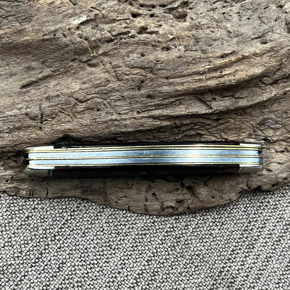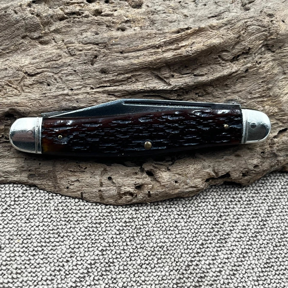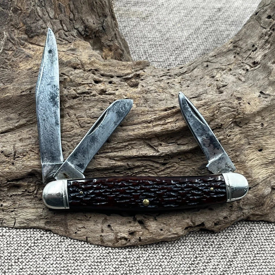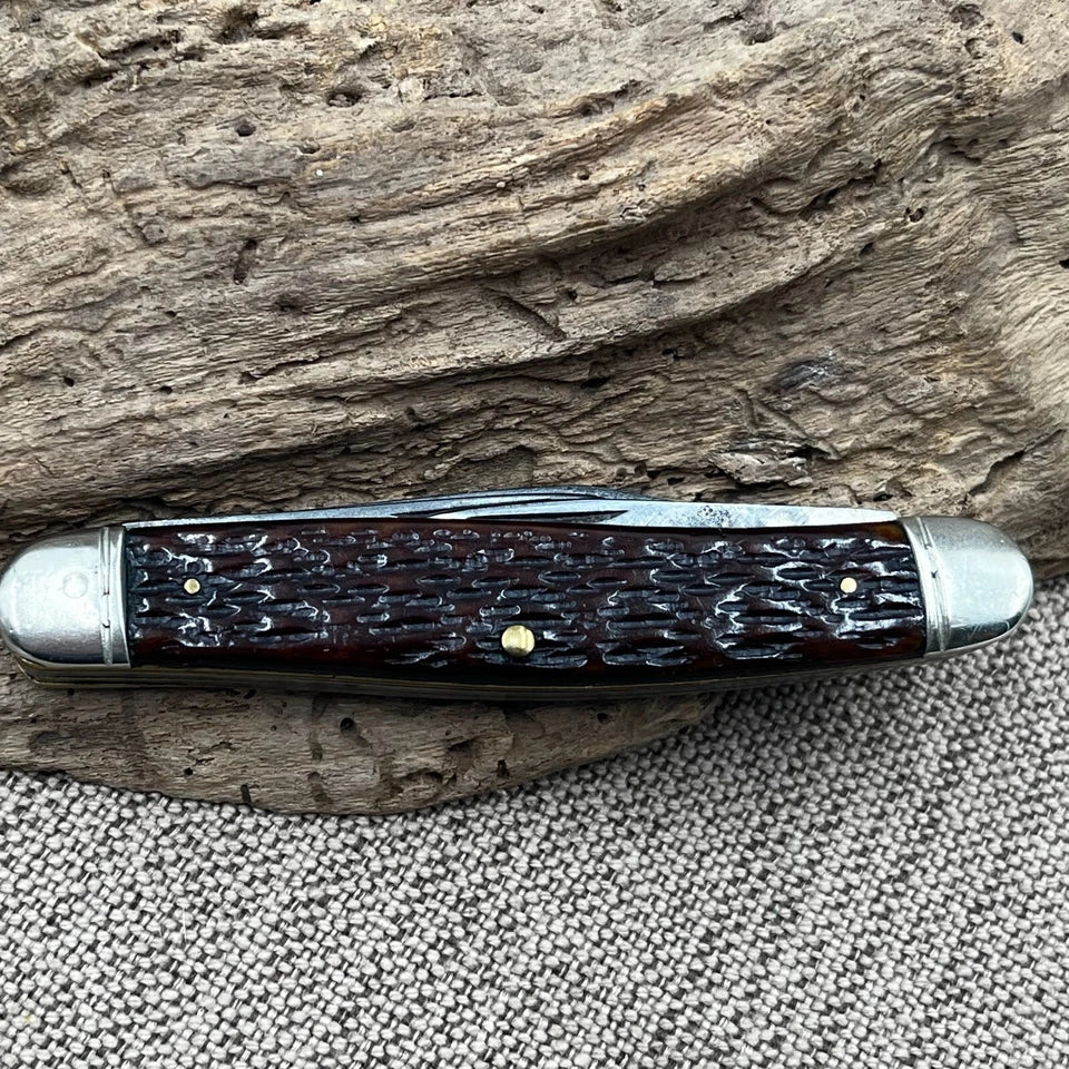 This KUTMASTER knife is a vintage folding knife made in Utica, NY, USA. It features a 3-bladed stockman design with a clip point, sheepsfoot, and spey point blade type. The blade range measures 2.76 - 4 inches with a plain edge. The knife is equipped with a manual opening mechanism and a slipjoint lock type. The handles are jigged Delrin and made of plastic with an ambidextrous dexterity design. The knife is a collectible folding knife and was manufactured in the United States. This knife is perfect for knife enthusiasts who are looking for a unique and vintage piece to add to their collection.
