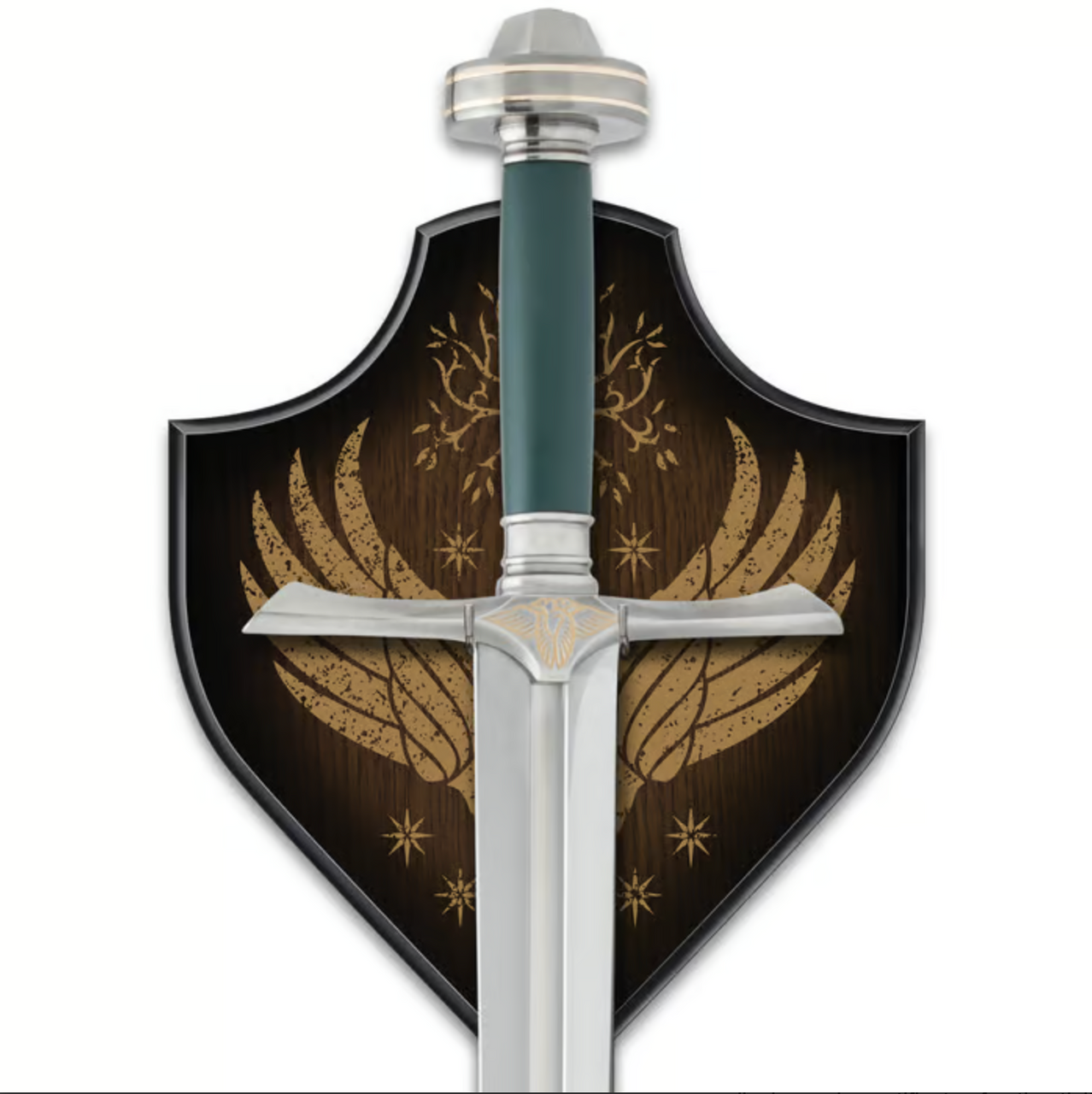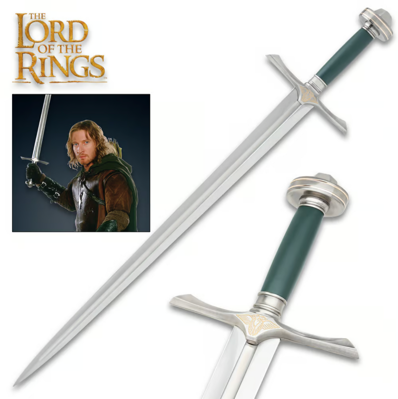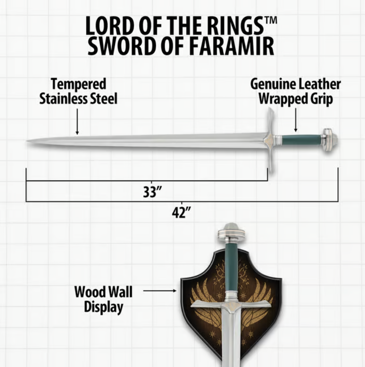 The sword of Faramir™, captain of the Rangers of Ithilien. Brother to Boromir™, Faramir was a noble and valiant soldier of Gondor who guarded its borderlands from the evil forces of Sauron. This authentically detailed sword replica is a reproduction of the actual filming prop sword crafted by Weta Workshop of New Zealand and used in THE LORD OF THE RINGS™ films presented by New Line Cinema. This meticulously detailed sword, with an overall length of 42", features a solid metal guard and pommel with an antique steel finish and a genuine leather wrapped grip. The cross guard is adorned with gold twin raven motifs and the pommel is accented with gold rings. The 33" false-edged blade is crafted of tempered stainless steel with a fuller groove. Each sword is presented with a wood wall display and certificate of authenticity.