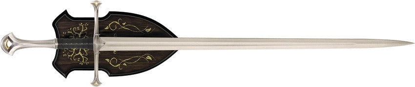 52.88" (134.32cm) overall. 40.63" (103.2cm) false edge 420 stainless blade. Black leather wrapped handle. Metal alloy guard and pommel. Antique silver plated finish handle with 24K gold fittings. Wood display plaque. Certificate of Authenticity. From Lord of the Rings movie series from New Line Cinema. Boxed.