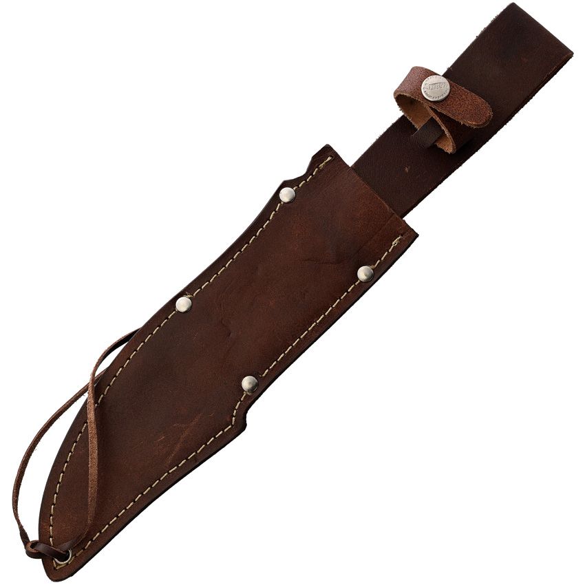 15" (38.1cm) overall. 10" (25.4cm) Damascus steel bowie blade. Stacked leather handle. Damascus guard. Brown leather belt sheath. Boxed.