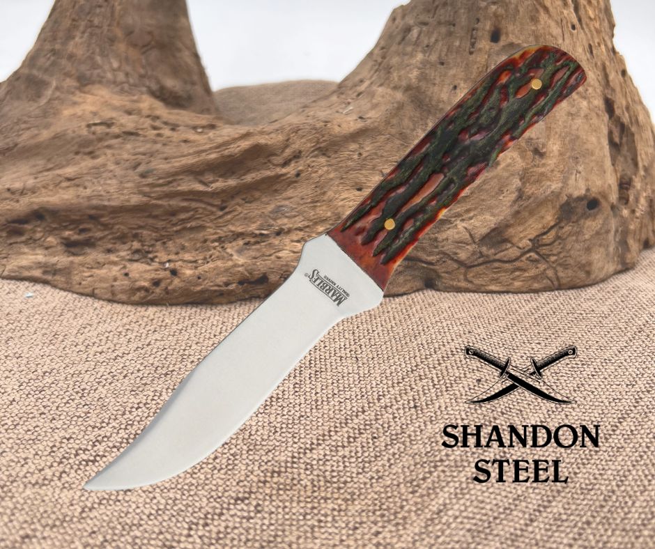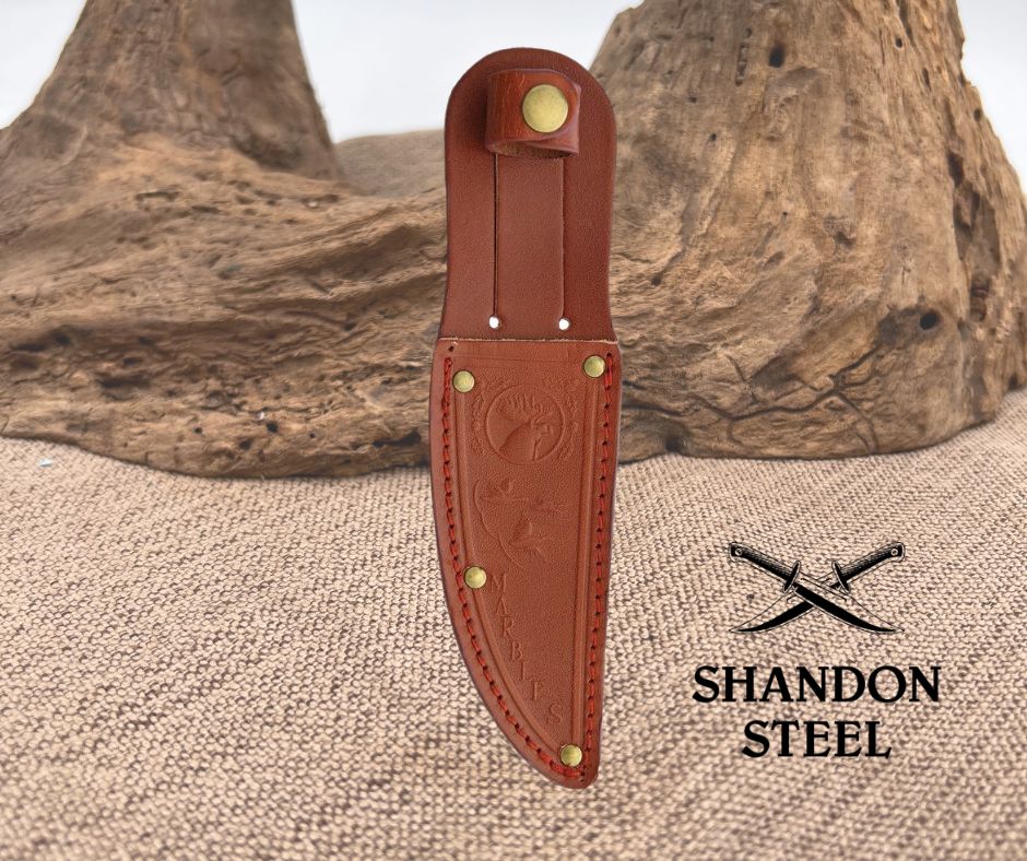 7.5" overall. 4" satin finish stainless clip point blade. Stag bone handle. Full tang. Brown leather belt sheath. Boxed.