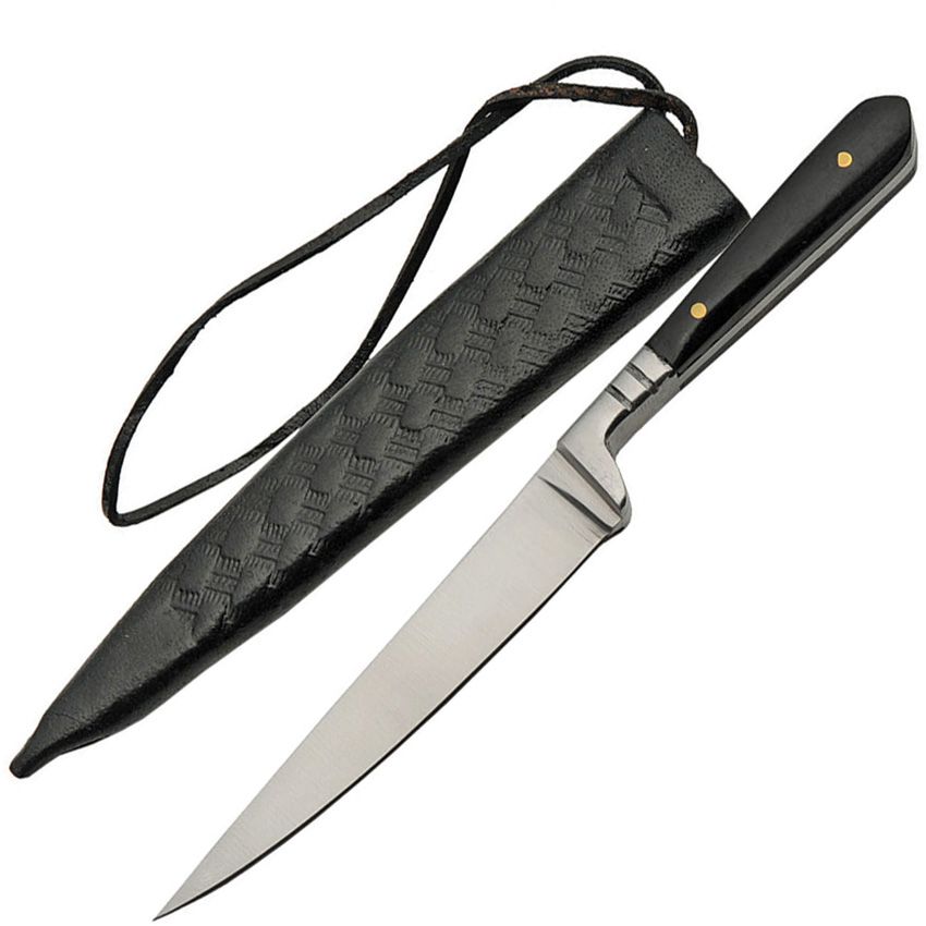 7" overall. 3.75" satin finish stainless blade. Horn handle. Stainless guard. Full tang. Brown leather sheath. Boxed.