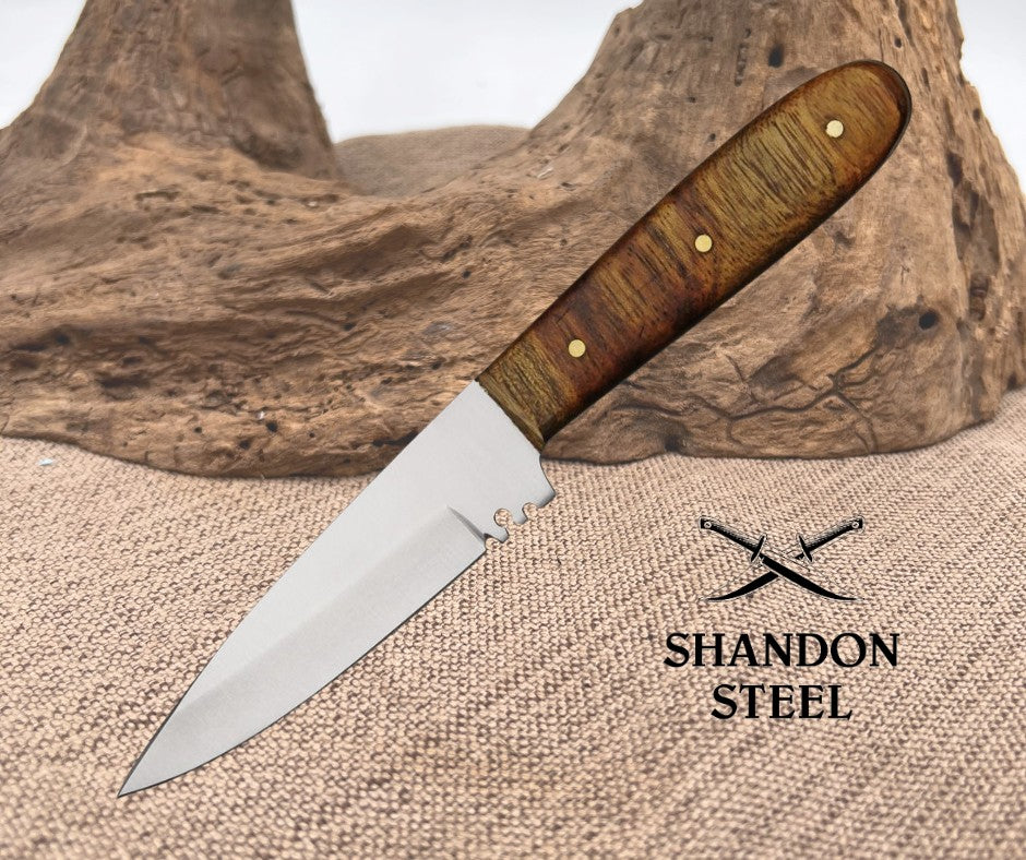 6 1/2" overall. 3 3/8" stainless blade. Full tang. Brown wood handles. Brown leather belt sheath with fringe and bead trim.