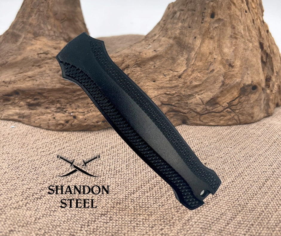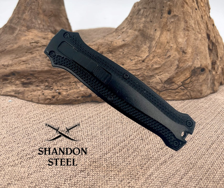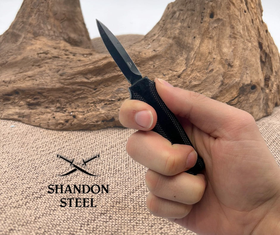 Mini automatic out the front 1.9" Dagger blade. 3.25" closed, 5.1" overall, black stainless steel blade, black aluminum handle with hole for keyring