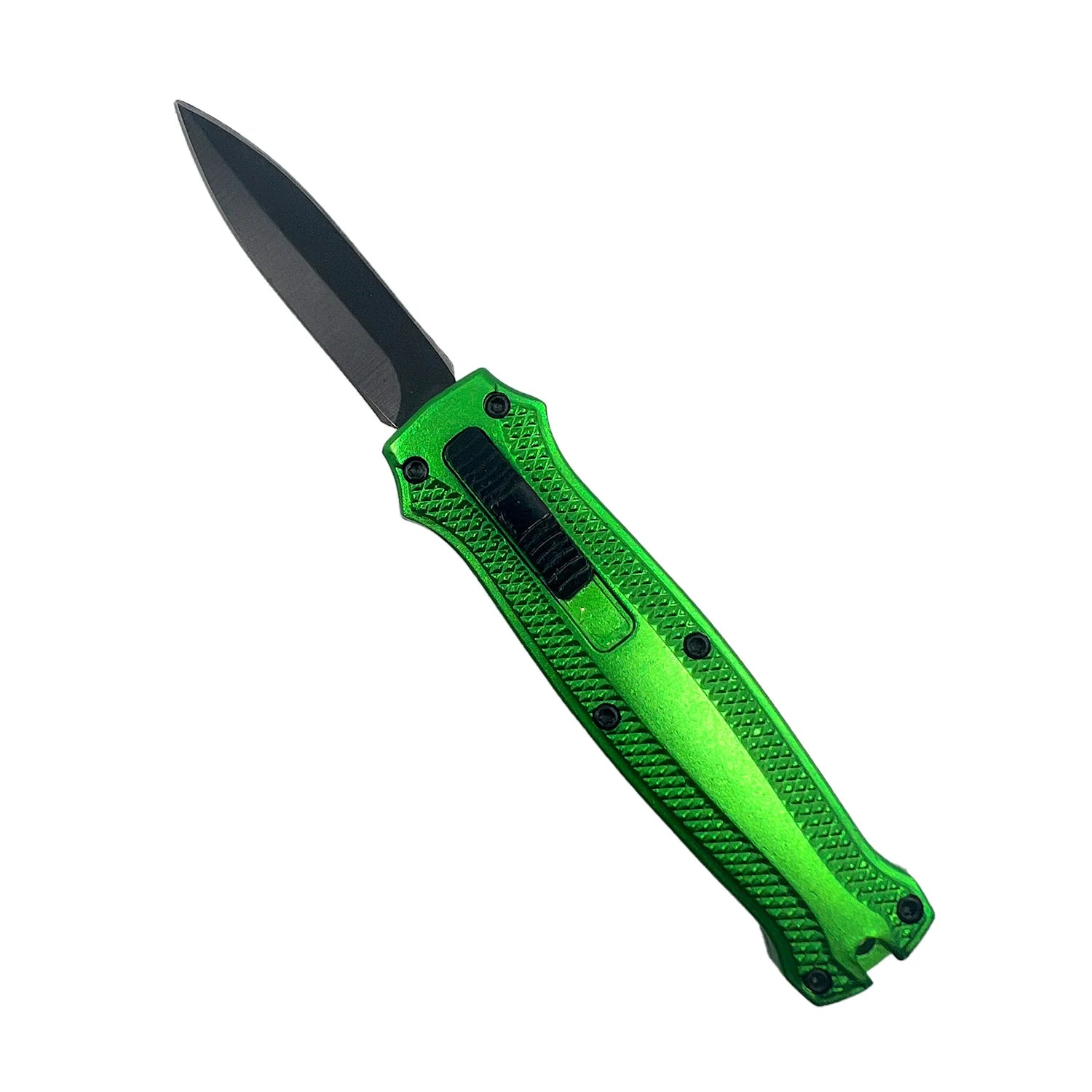 Mini automatic out the front 1.9" Dagger blade. 3.25" closed, 5.1" overall, black stainless steel blade, black aluminum handle with hole for keyring