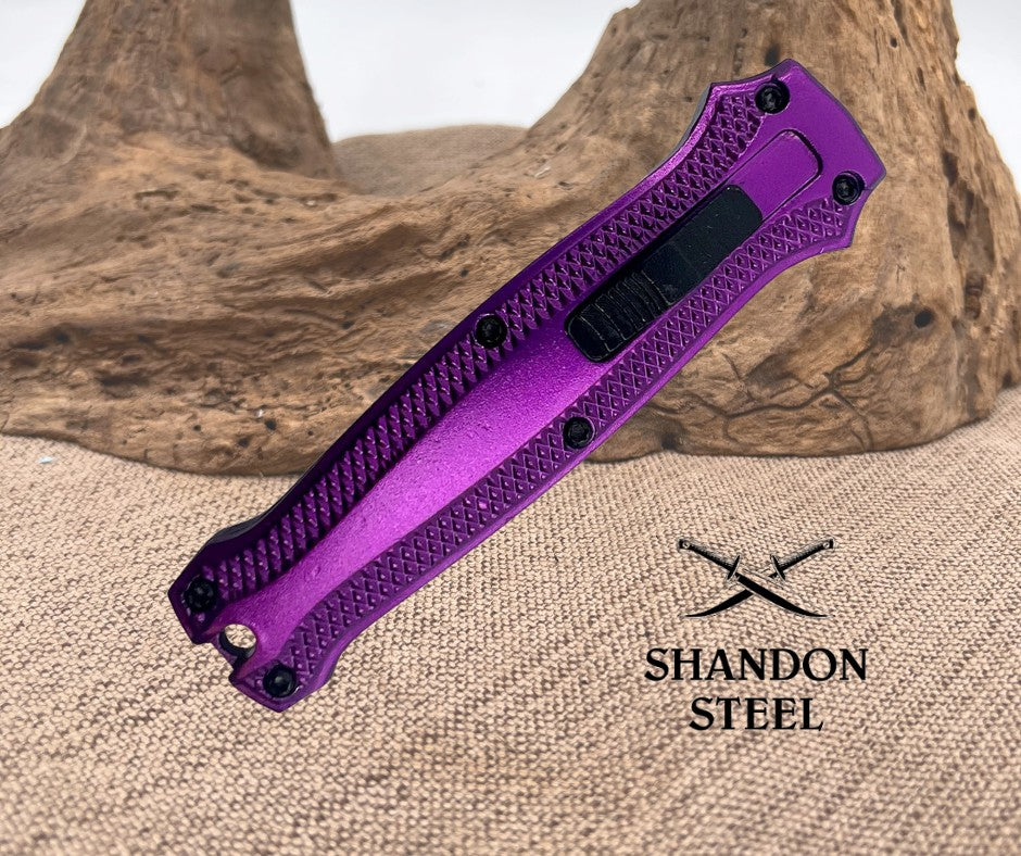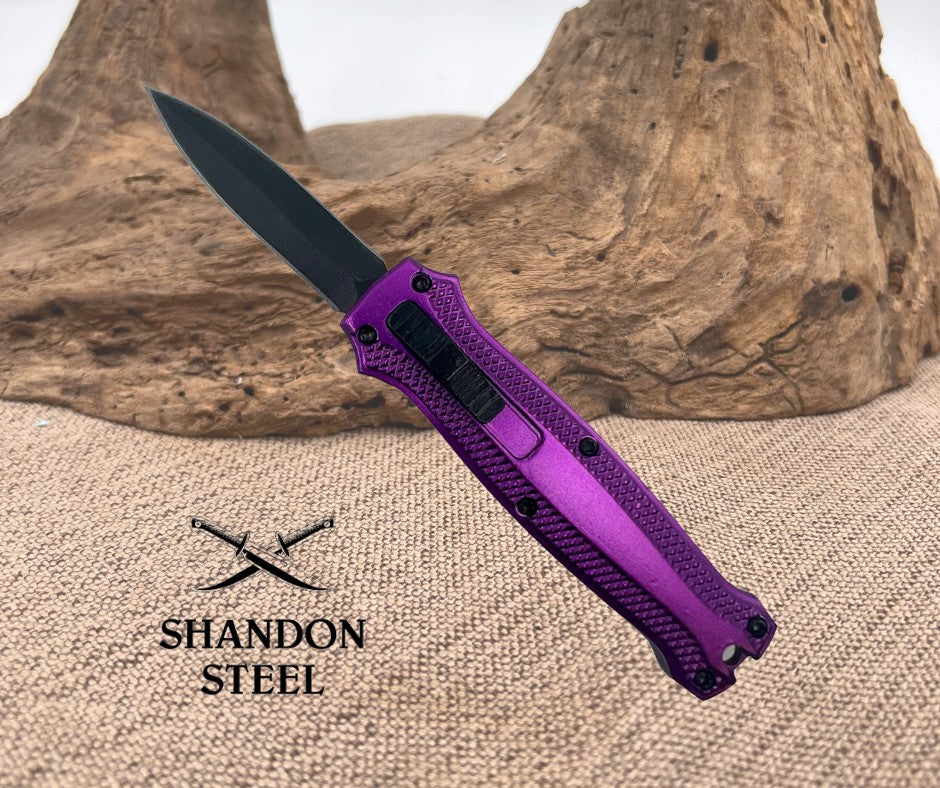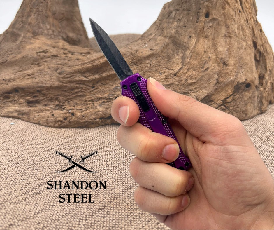 Mini automatic out the front 1.9" Dagger blade. 3.25" closed, 5.1" overall, black stainless steel blade, black aluminum handle with hole for keyring
