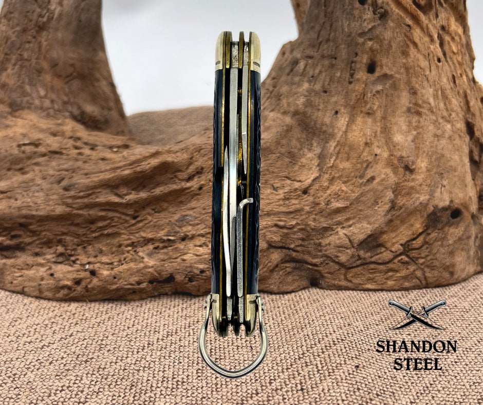 The New York Knife Schrade Diamond Jubilee 75th Anniversary 1910-1985 Boy Scout pocketknife is a vintage collectible with a blade range under 2.75 inches. It features a manual opening mechanism with a lockback design, making it safe and convenient to use. The knife includes tools like a screwdriver and bottle opener, and its handle is made of jigged Delrin material in a black color. With four blades and a pen blade type, this original Schrade knife from 1985 celebrates the brand's legacy in the United States.