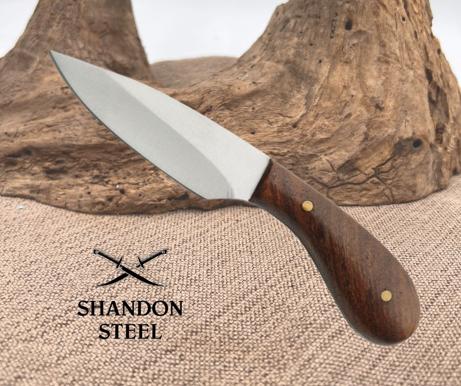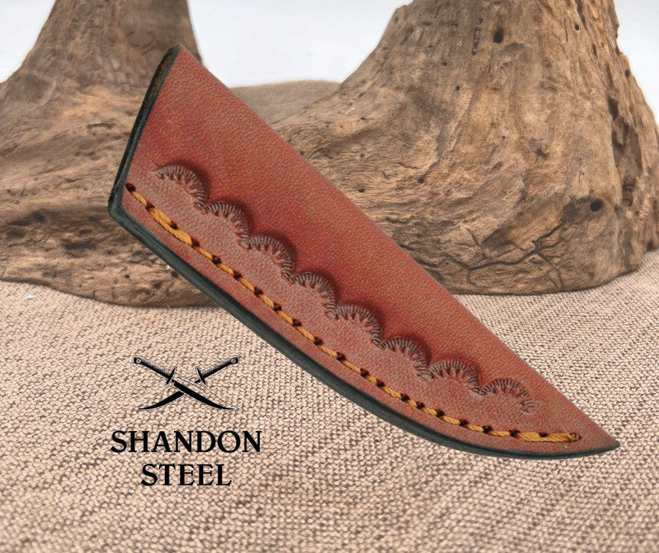 4 1/4" overall. 2 1/4" stainless drop point blade. Full tang. Brown burlwood handles. Brown leather belt sheath.